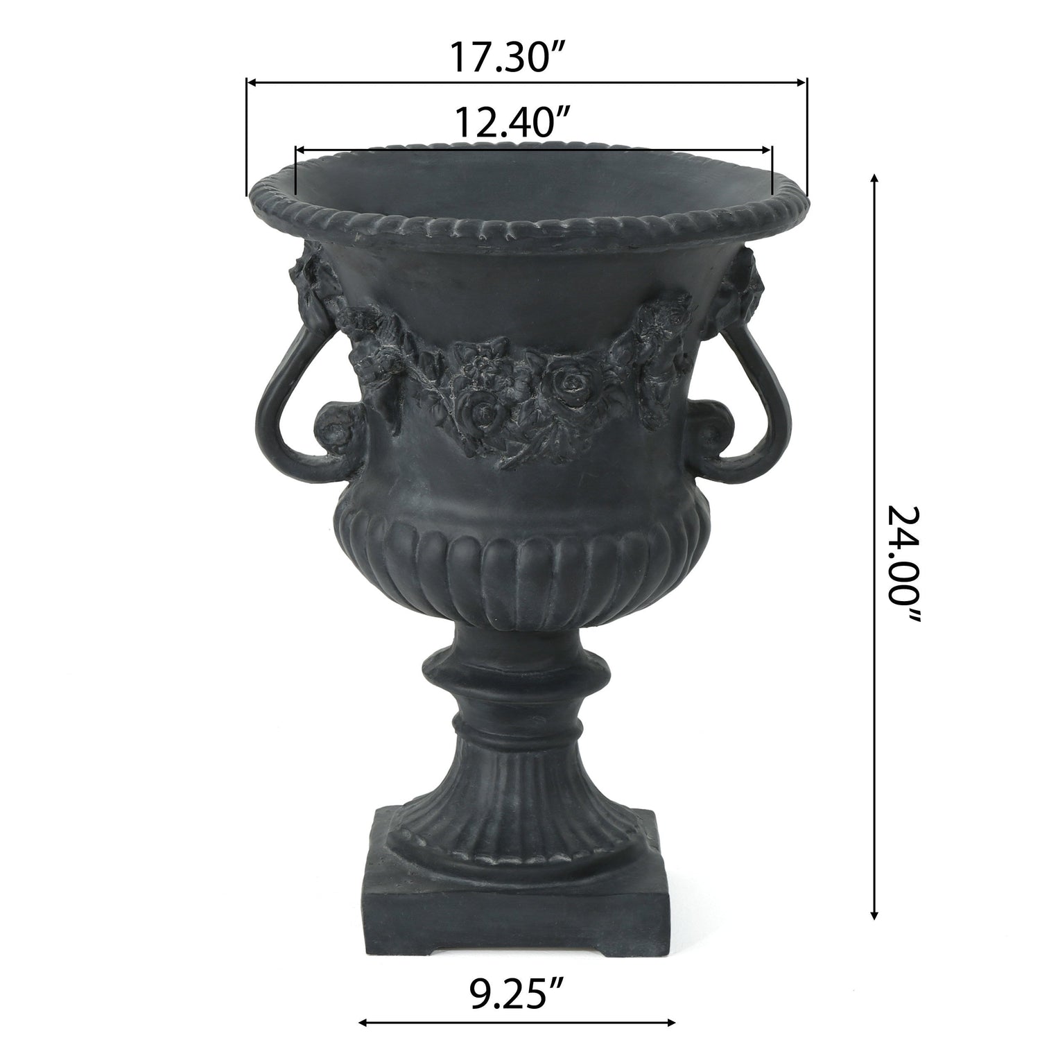 The Buena Vista Urn is a decorative planter ideal for enhancing both indoor and outdoor spaces such as patios and gardens. It blends practical plant display functionality with a timeless antique black finish that complements various décor styles.
