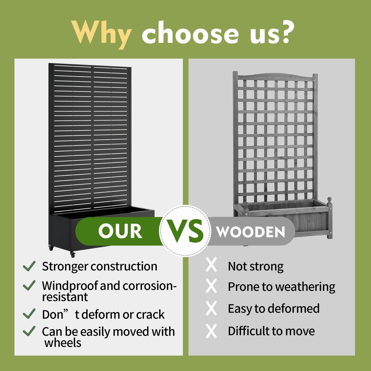 This metal planter box with trellis is designed to enhance your patio or garden by serving as a raised garden bed, a climbing plant trellis, and a privacy screen, combining function and style for outdoor living spaces.