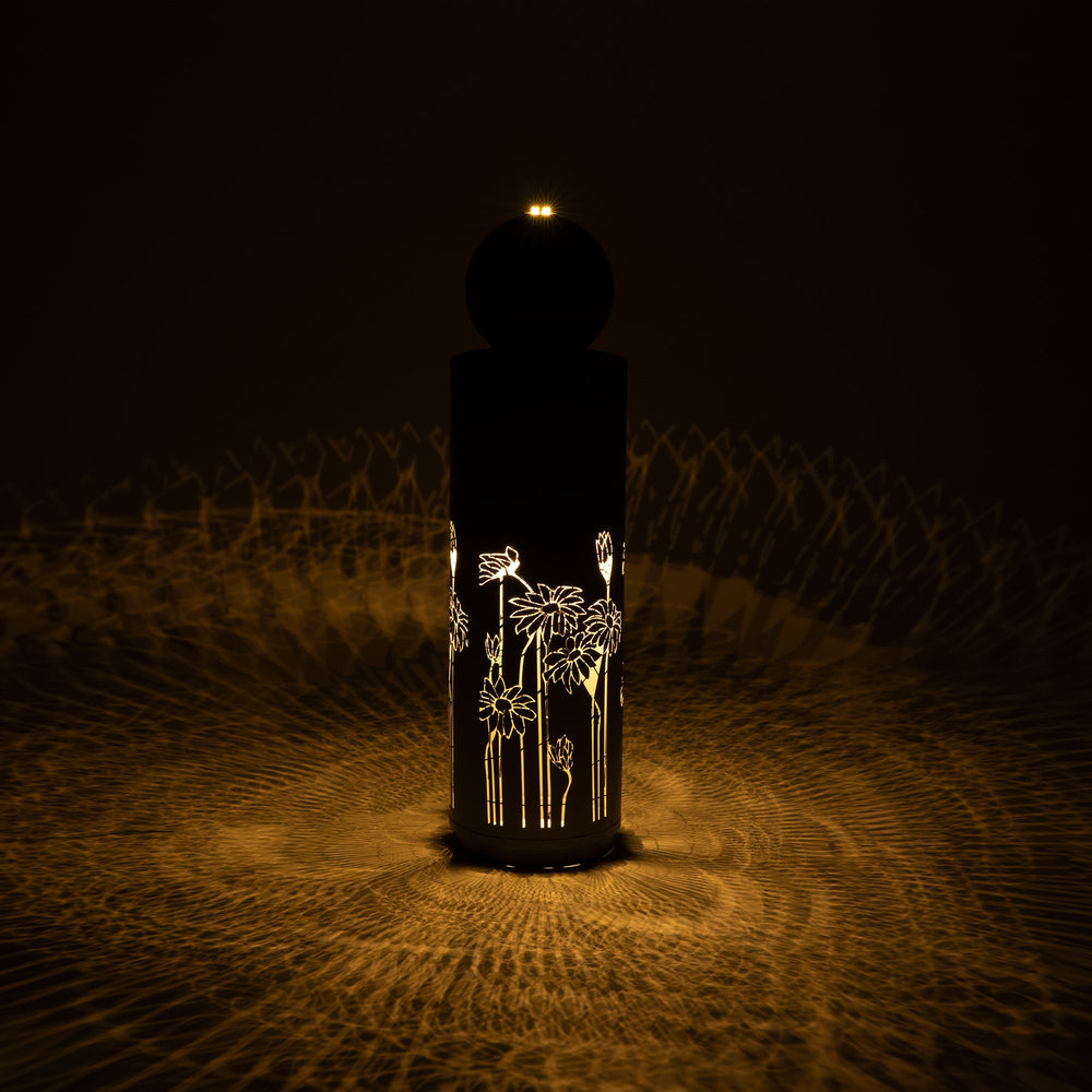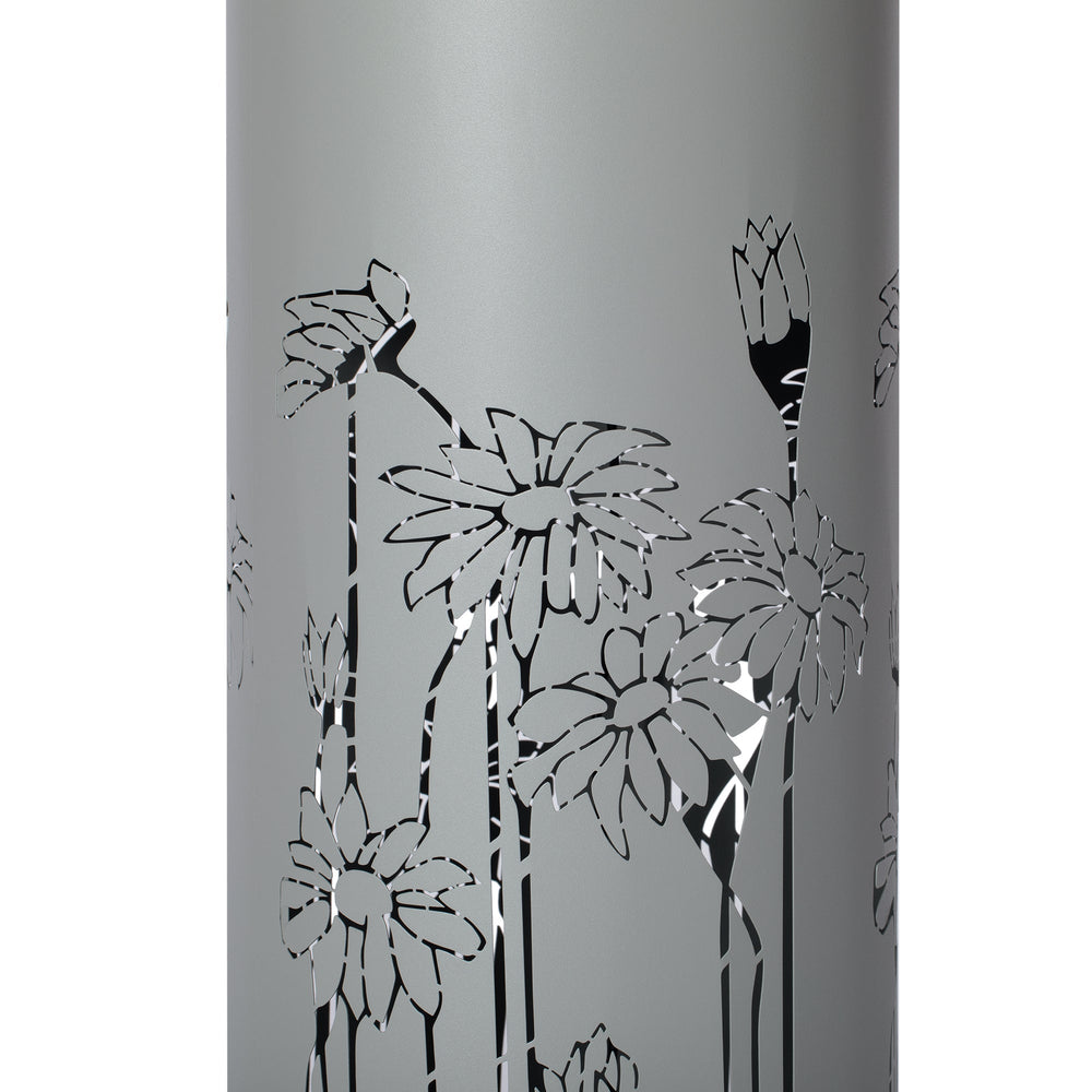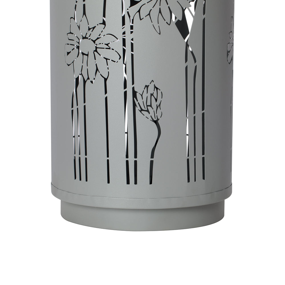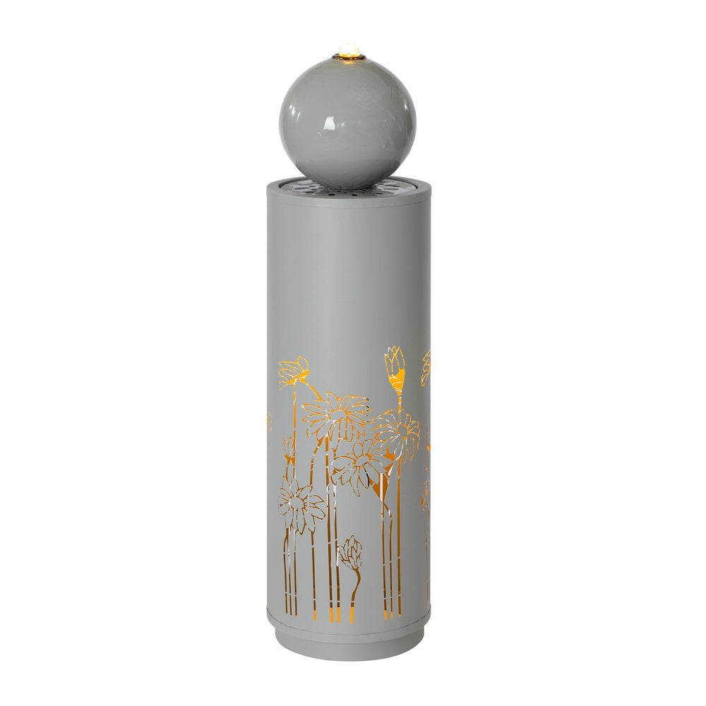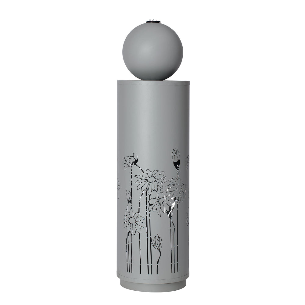 This modern freestanding outdoor water fountain features a sleek light gray metal construction with a sphere-top design and intricate floral cutouts. Ideal for enhancing patios, gardens, or backyards, it combines style and function to create a tranquil ambiance.