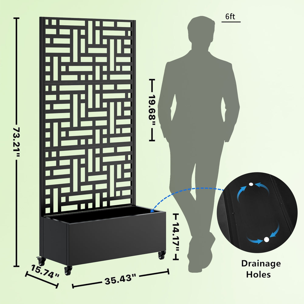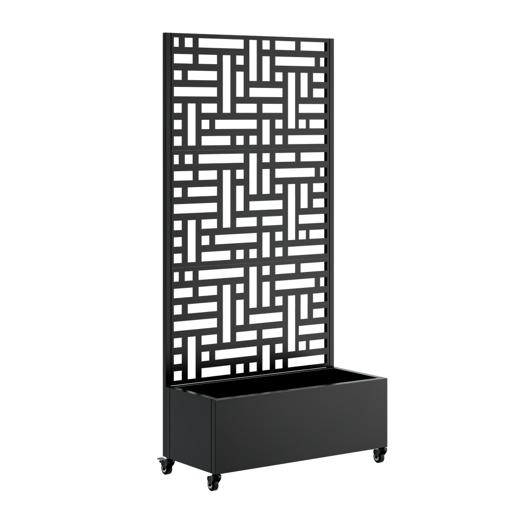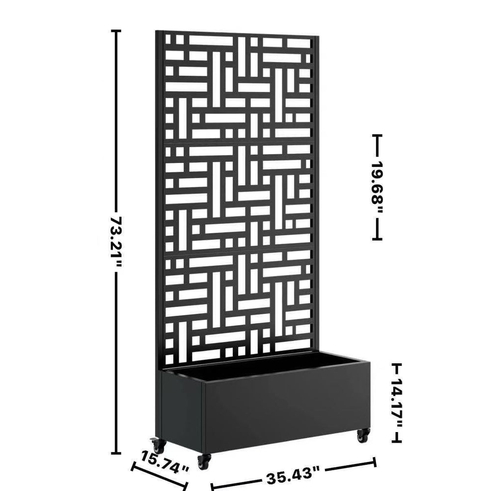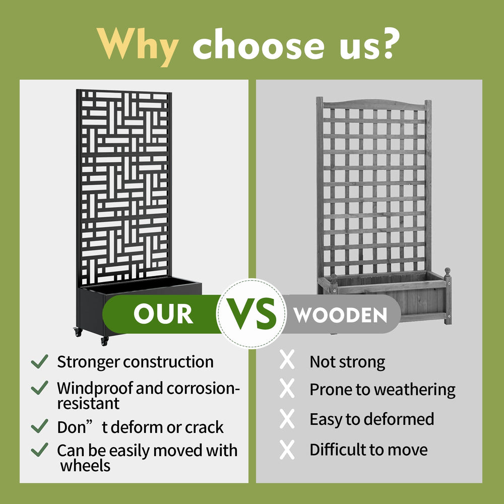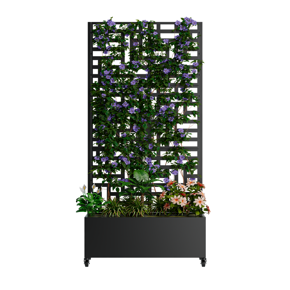 This metal planter box with trellis is a versatile addition for your patio or garden, serving as a raised garden bed, climbing plant support, and privacy screen. It combines functionality with a modern outdoor aesthetic.