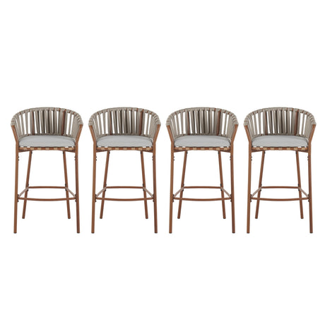 Lodi Outdoor Metal Rope Barstool, Teak Finished Frame and Beige Cushion, Set of 4