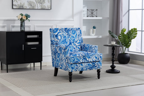Upholstered Accent Chair with Blue and White Porcelain Print Linen Fabric