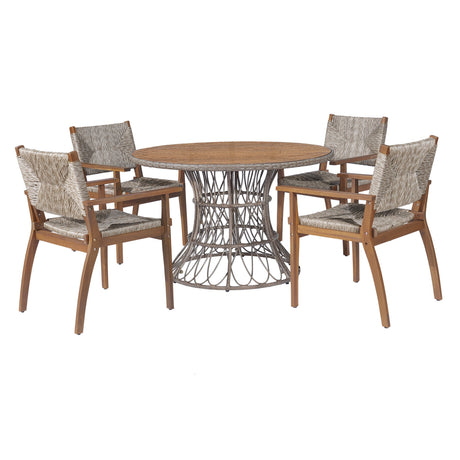 5-Piece Outdoor Dining Set: Brown Round Acacia Wood Table & 4 Brown Wicker Armchairs