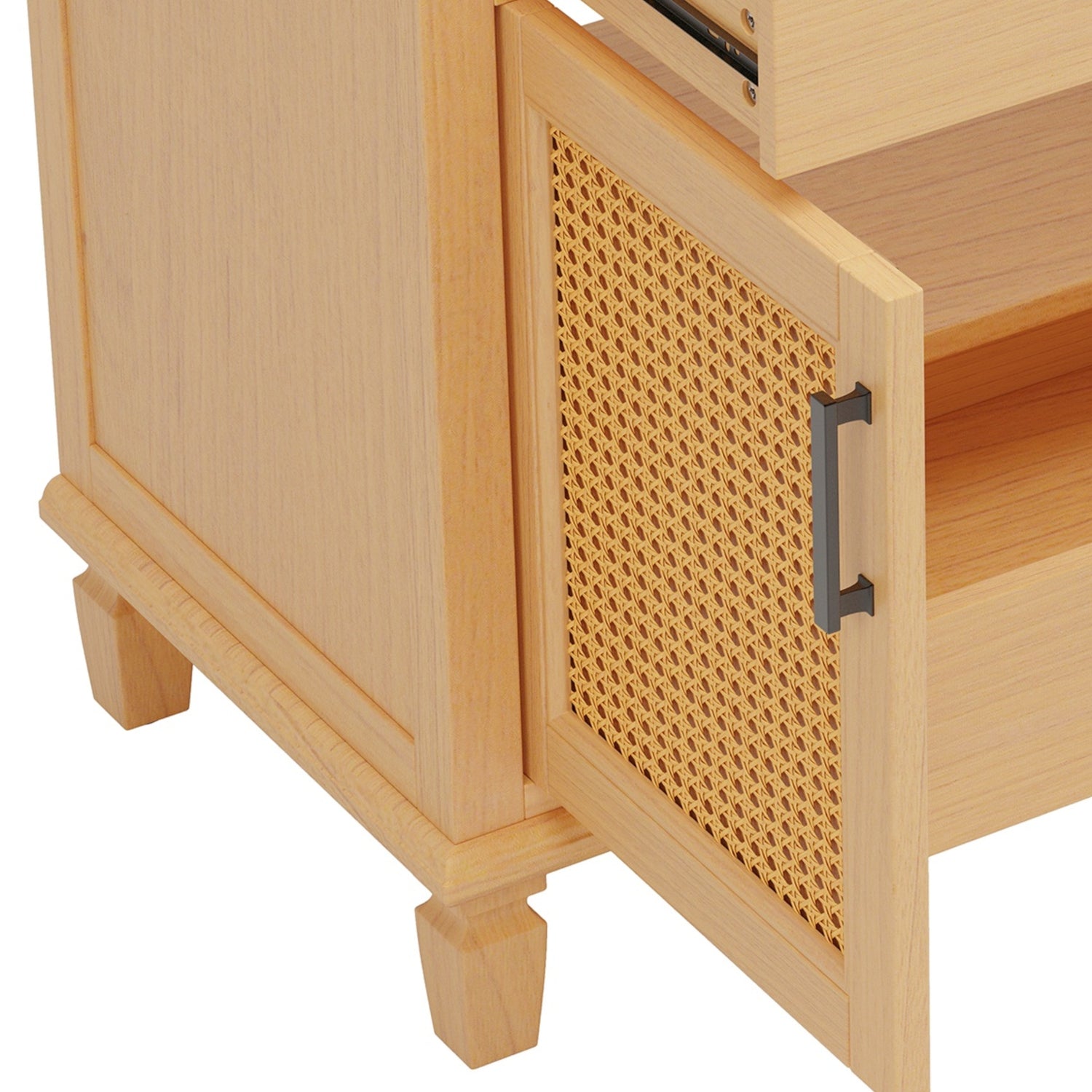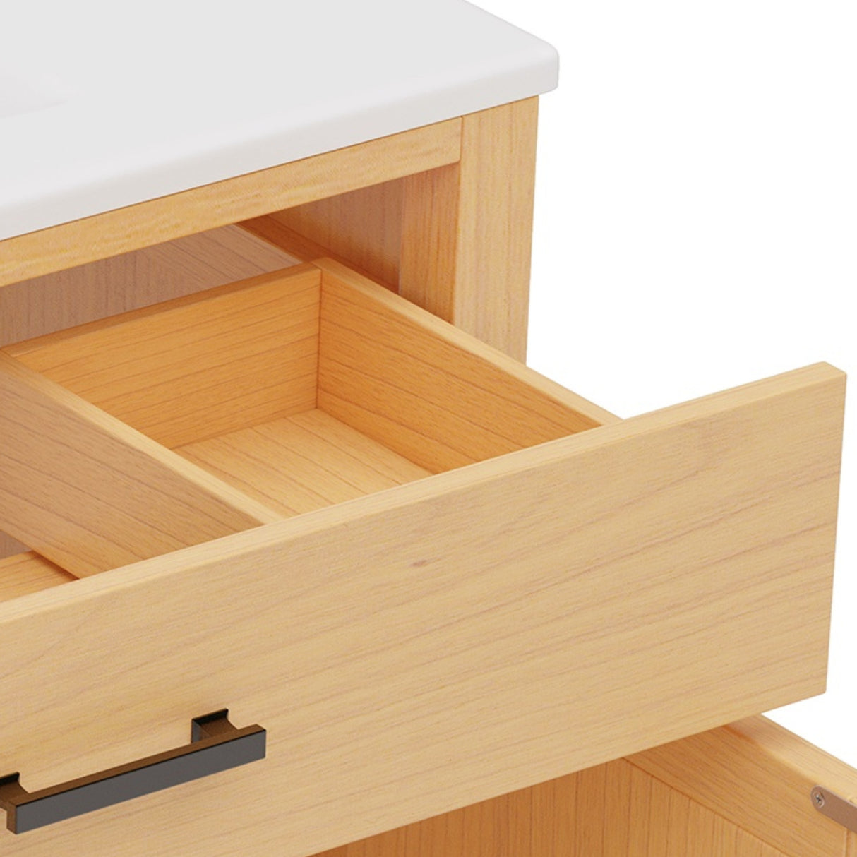 Storage is intelligently designed: behind the dual rattan cabinet doors lies an adjustable shelf ideal for tall containers or neatly folded towels. Below the sink, a concealed undermount drawer with hidden runners maximizes usable depth without compromising design integrity. Two additional side-mount drawers provide full-extension glides, soft-close function, and subdivided interiors—ideal for organizing small essentials like razors, cosmetics, and grooming tools.