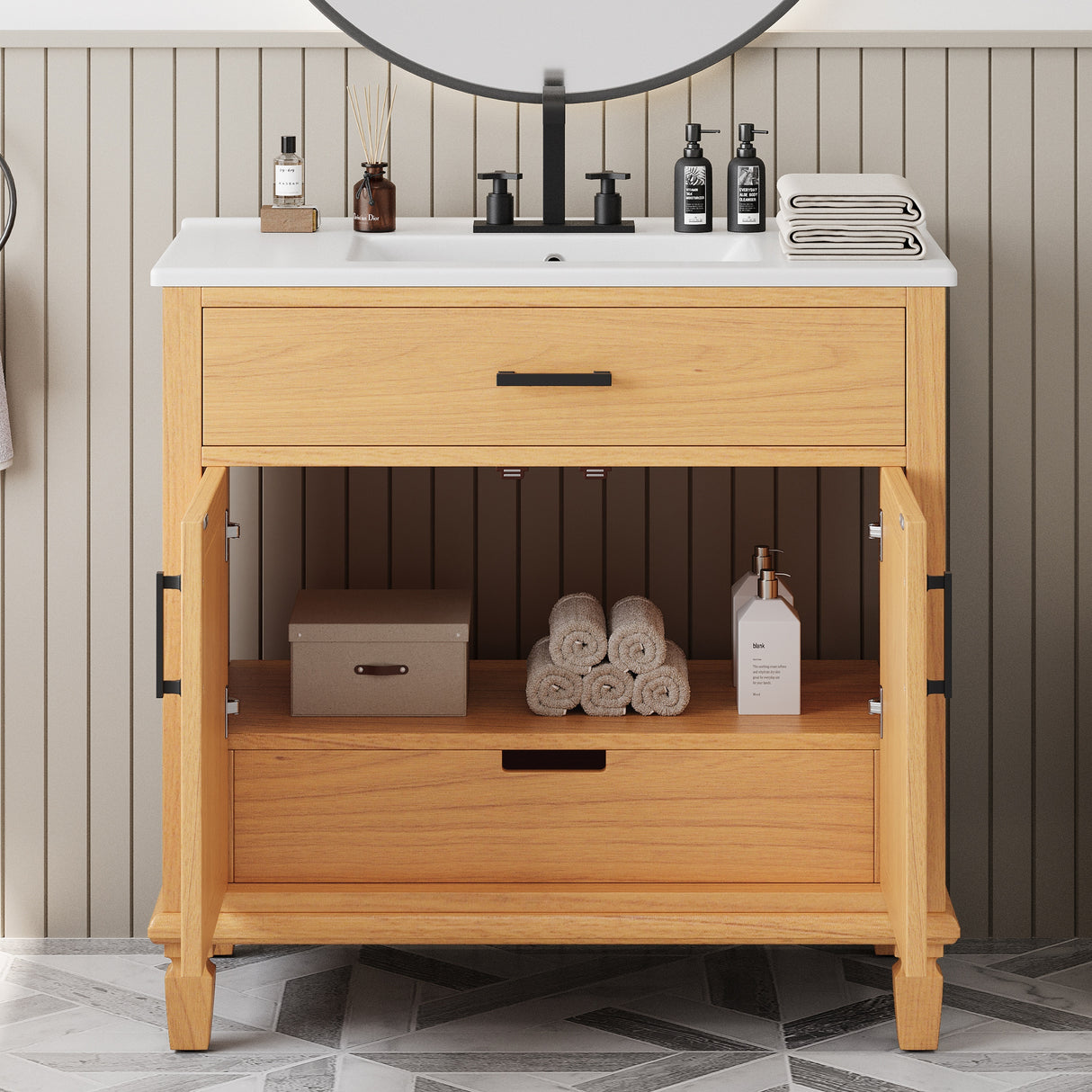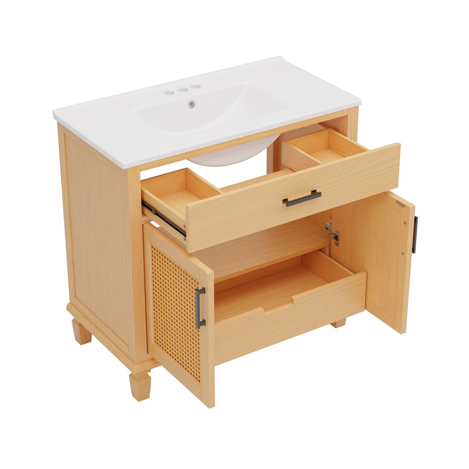 This is the 36" bathroom vanity that seamlessly blends handcrafted artistry with contemporary convenience, creating a sophisticated statement piece for the discerning homeowner. Woven by skilled artisans, the cabinet's rattan doors present a richly textured pattern, offering an organic warmth rarely found in mass-produced alternatives. The result is a bathroom centerpiece that radiates calm refinement while serving the practical needs of modern living.