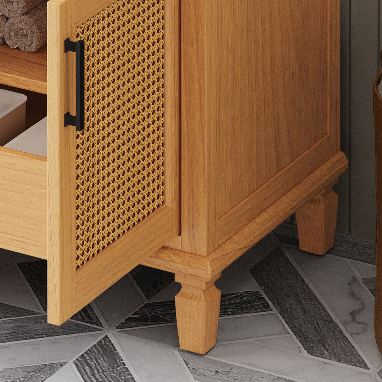 Each element, from the handcrafted weave to the soft-close hinges, is carefully chosen to deliver a vanity that is not only visually elegant but exceptionally functional. It arrives in one box with all hardware included for straightforward assembly.