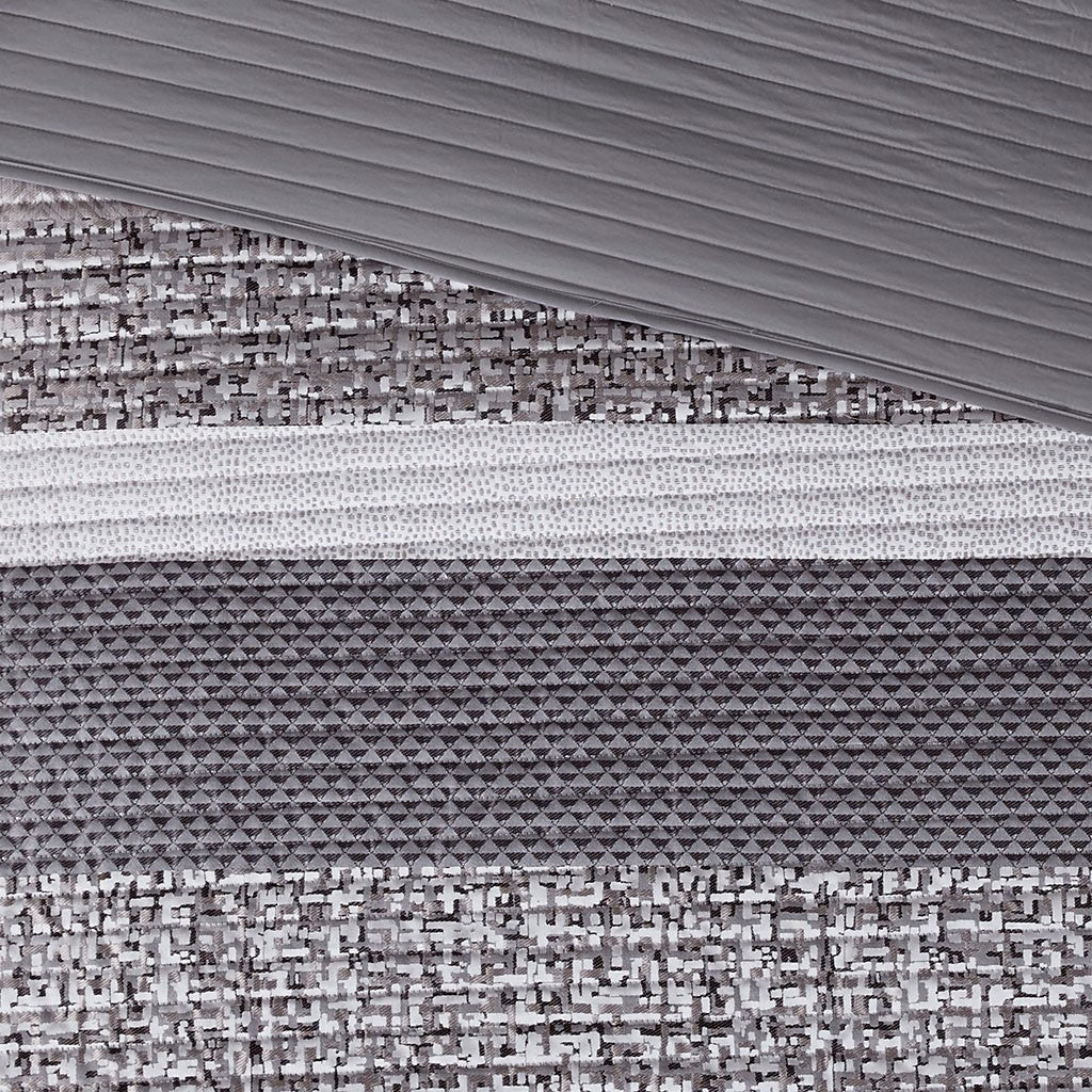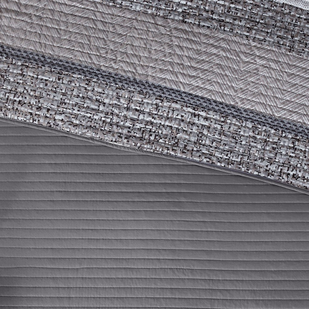 Give your bedroom a new luxurious look with the Madison Park Rhapsody 6 Piece Reversible Jacquard Quilt Set. This reversible quilt features a grey and taupe stripe design of several different motifs on the face with a solid grey reverse, for a chic transitional look. The 2 matching shams complement the design of the quilt to complete this glam comforter set. Also included are 3 decorative pillows with embroidery and pleated details that provide the finishing touches. Machine washable for easy care, this jacquard quilt set brings a sophisticated update to your bedroom that’s perfect for summer use or as an extra layer of warmth in the winter.