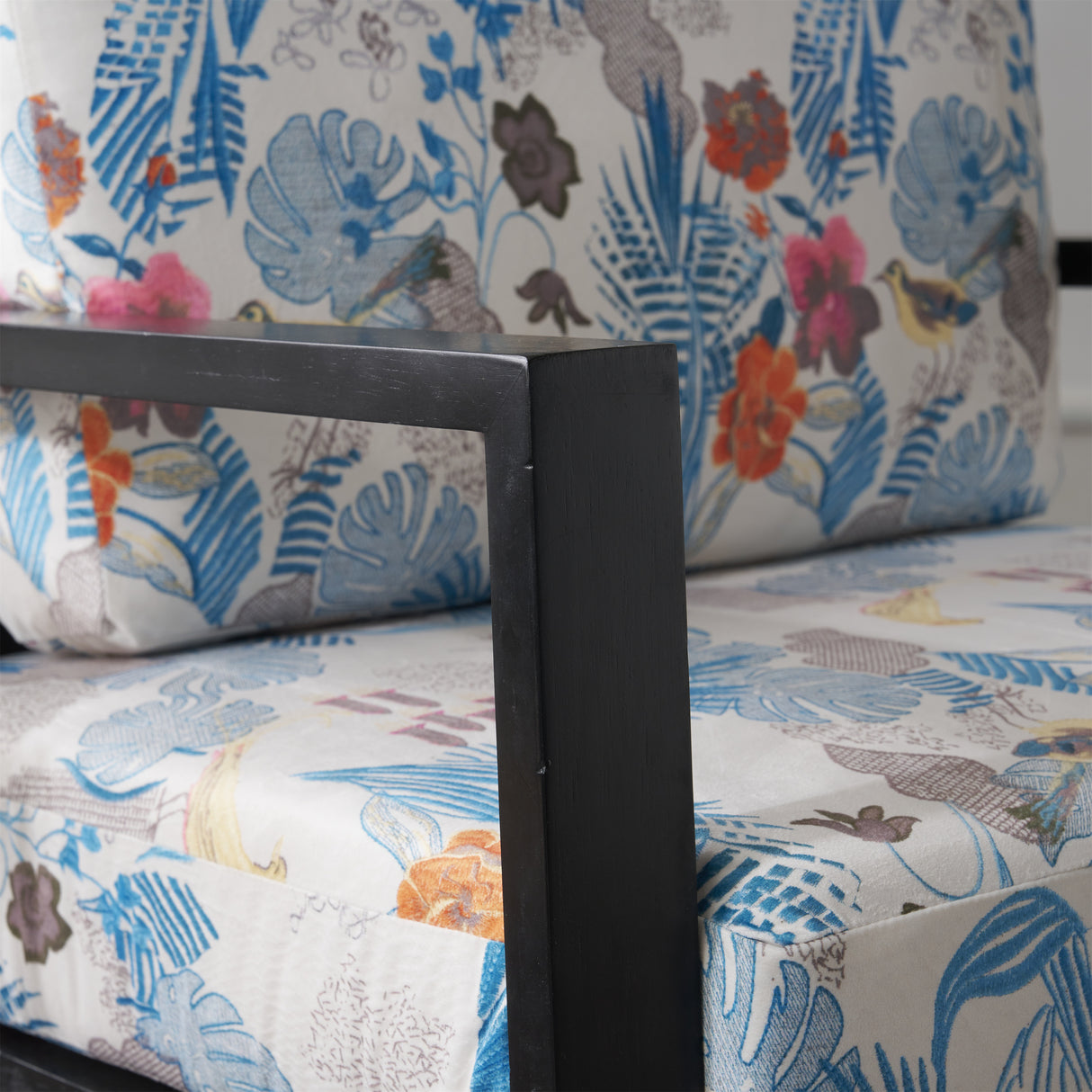 Upholstery: Blue floral print inspired by abstract art and nature motifs