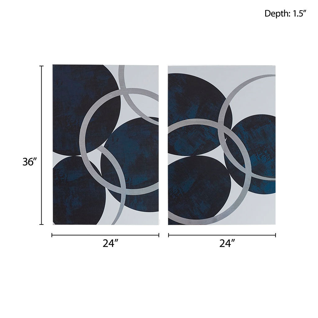 Inspired by planetary rhythm and lunar stillness, The Orbis Argentum Diptych—Latin for “Silver Orbit”—balances bold abstraction with celestial serenity. From our Celestiale Contempo™ Collection, this commanding set of two panels showcases richly saturated navy orbs orbiting across a field of crisp white, accented with metallic silver leafing that gleams subtly in shifting light.