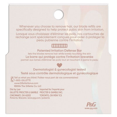 Venus's pubic hair and skin blades are specifically designed to help protect pubic skin from shave irritation. They have a patented Irritation Defense Bar and optimally spaced blades that allow the blades to cut hair while barely touching the skin. Also, the razor refills come equipped with a precision trimmer on the back of the blades to help with tricky areas.