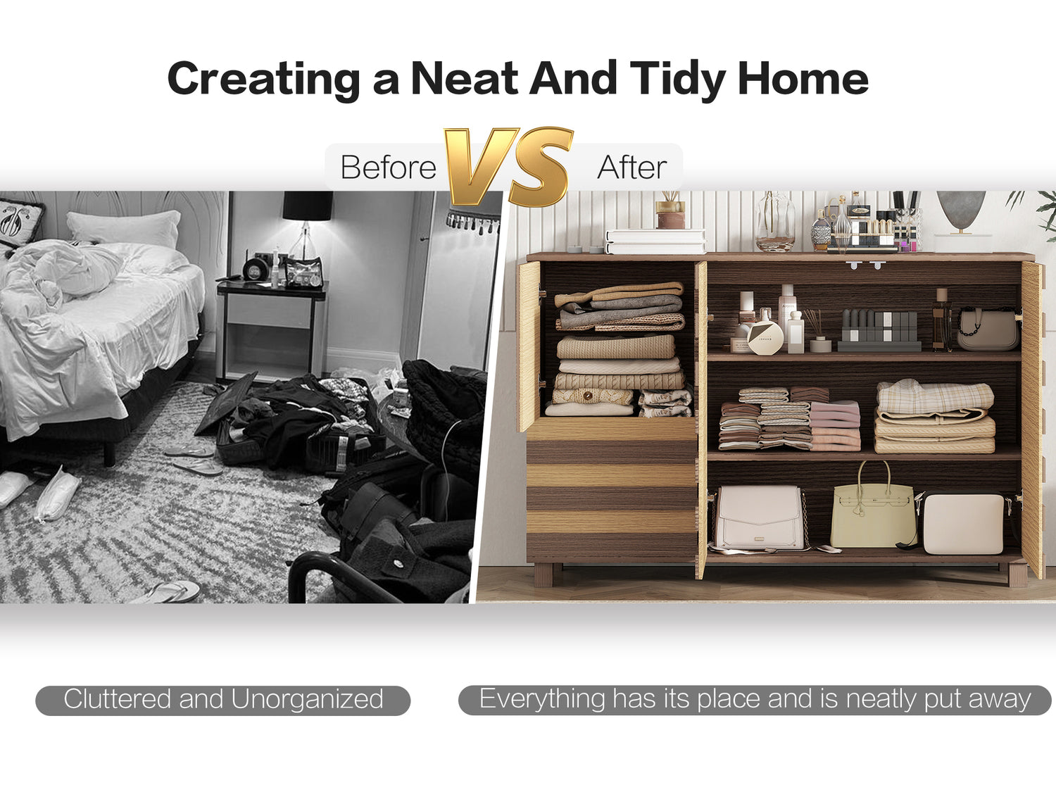 - Ample and Organized Storage with 2 Drawers & 3 Doors: Equipped with 2 functional drawers and 3 spacious doors, this versatile cabinet offers abundant storage space. Drawers are ideal for stowing small items like utensils or living room essentials, while the 3-door compartments with adjustable shelves accommodate larger items such as dinnerware or coffee bar supplies, keeping your space tidy.