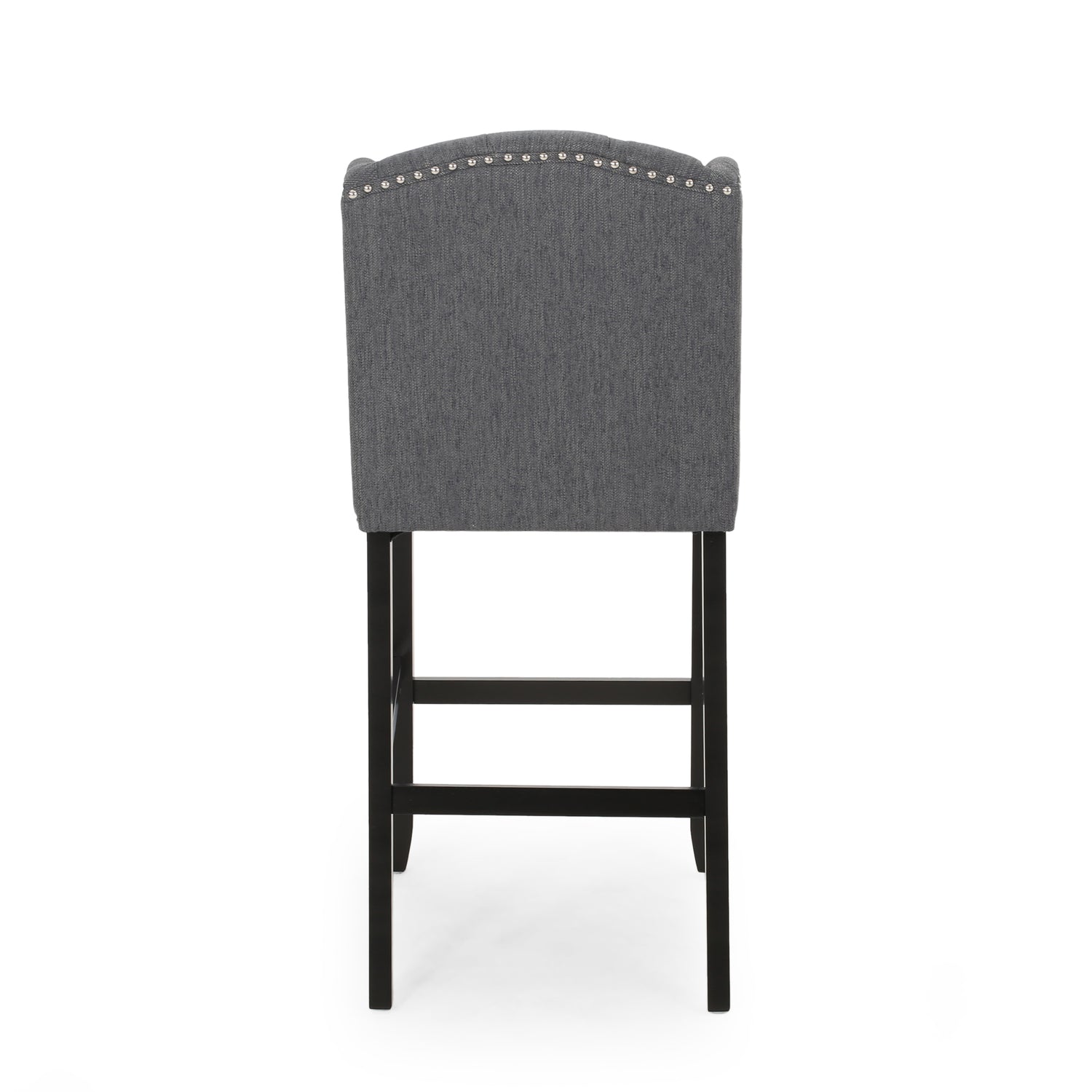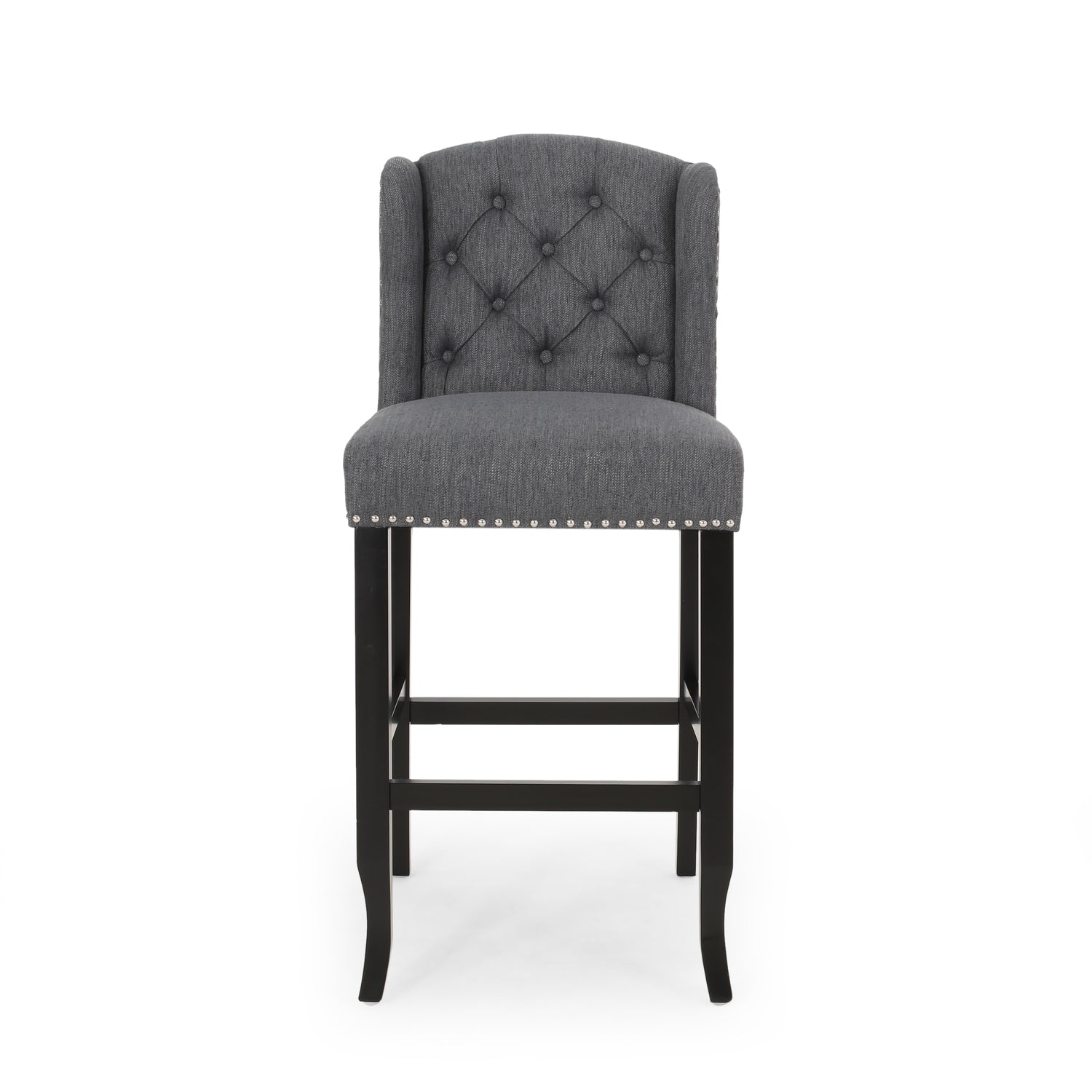 Pull up our bar stool to your home bar under cozy ambient lighting and sip on a glass of wine in sophisticated style. Our barstools offer a classic button-tufted backrest with diamond-patterned stitching and a refined wingback design, giving you interior space an elegant touch. Finished with an exquisite nailhead trim and solid rubberwood frame, these stools offer upholstered seating that truly accentuates the superior style of your home while providing sturdy durability to any kitchen counter or indoor bar. Includes: Two (2) Barstools Material: Fabric Composition: 100% Polyester Leg Material: Rubberwood Multiple Color Options Finish: Chocolate Assembly Required Dimensions: 24.00 inches deep x 20.50 inches wide x 45.25 inches high Seat Dimensions: 17.00 inches deep x 20.50 inches wide x 31.00 inches high