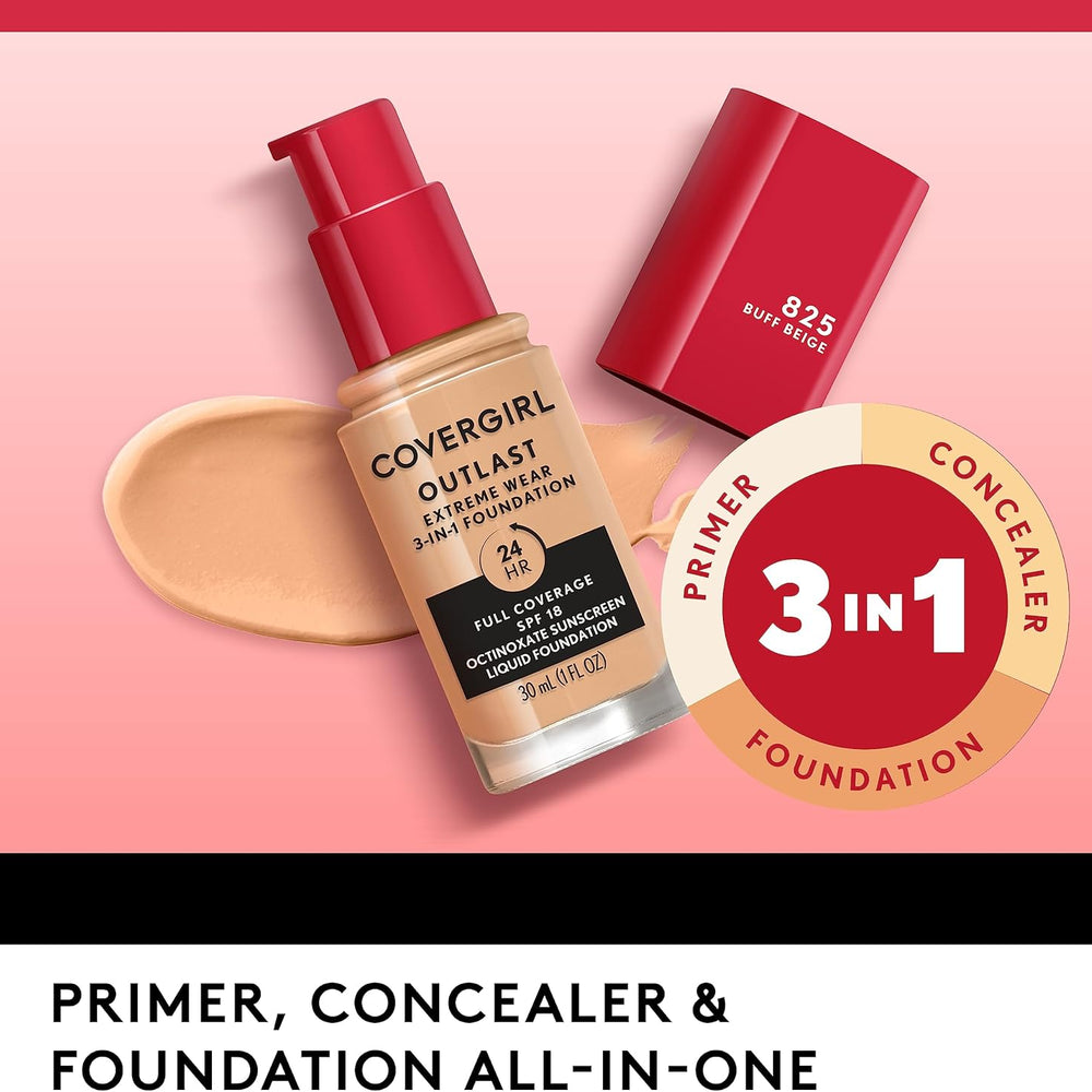 Speed up your beauty routine with a long-lasting foundation, primer, and concealer all-in-one! Whether you dab on a little or a lot, the Covergirl Outlast Extreme Wear 3-in-1 Full Coverage Liquid Foundation is sure to be your go-to when it comes to providing the naturally flawless full coverage finish you crave. The lightweight, cake-free foundation has a 24-hour formula that blends seamlessly, covers imperfections, and is available in a variety of shades. Helping defend your skin against the elements, the hydrating, breathable foundation contains SPF 18 sunscreen and is sweat-, transfer-, and humidity-proof. Apply the face makeup using your fingertips, a foundation brush, or a makeup sponge. Pro-tip: Pair with an Outlast All Day Lip Color for an easy, breezy, long lasting look.