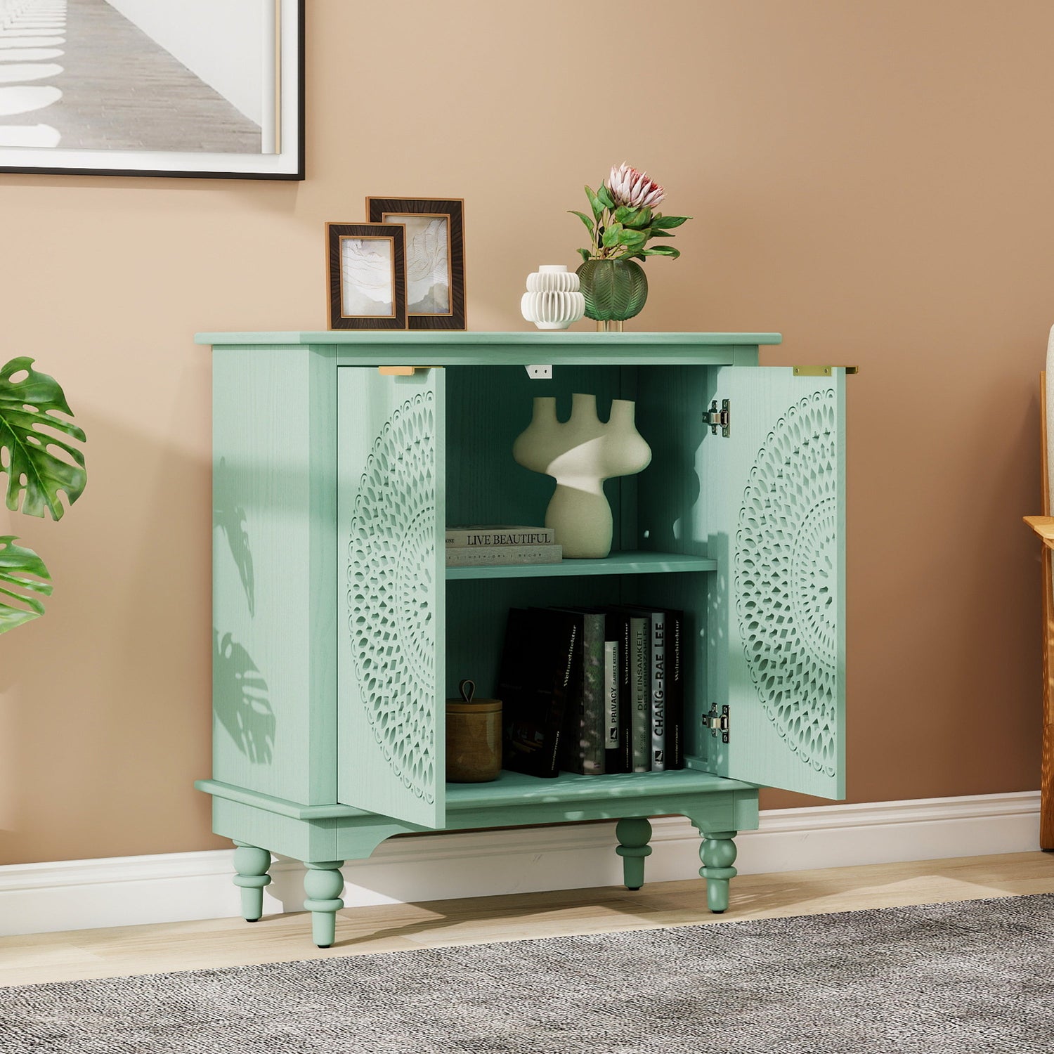 This modern accent cabinet features a hollow-carved design and serves as a versatile storage solution for entryways, living rooms, or bedrooms. Its stylish light green finish adds both function and aesthetic appeal to your space.