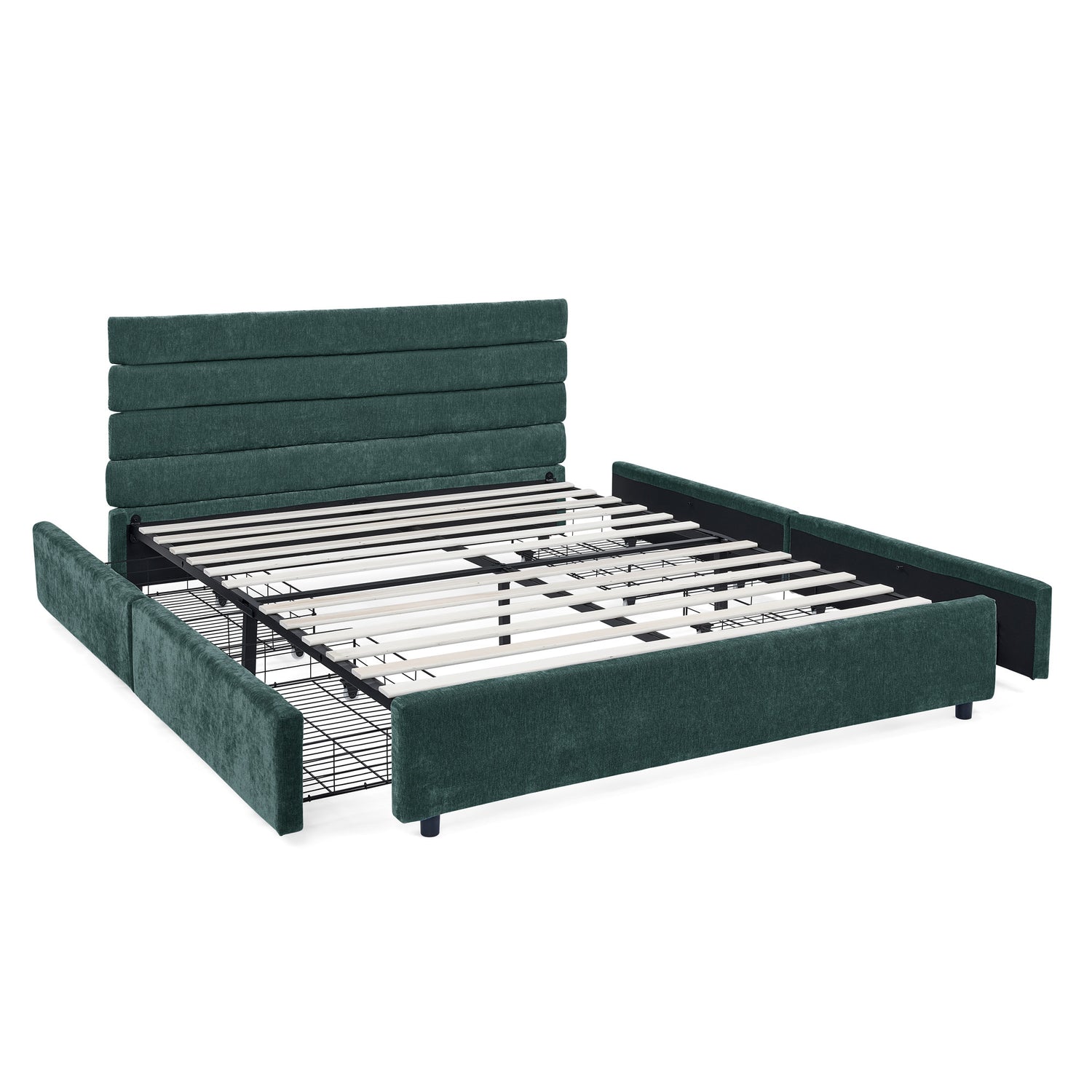Modern Queen Size Cushioned Bed Frame with Headboard and Drawers - Blue and Green Velvet, 85'x66'x36'