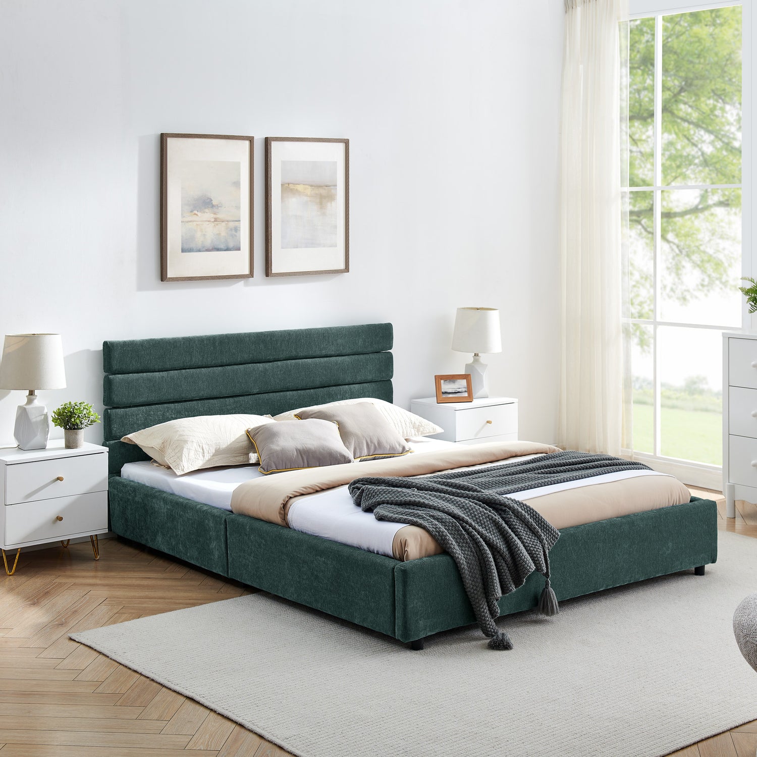 • [Modern Elegant Queen Size Platform Bed] - The clean lines of this upholstered platform bed queen size create a peaceful atmosphere, and the unique design of the headboard, footboard and side rails give a cozy feel that will not only fit in with any home decor, but will become the centerpiece of your room.