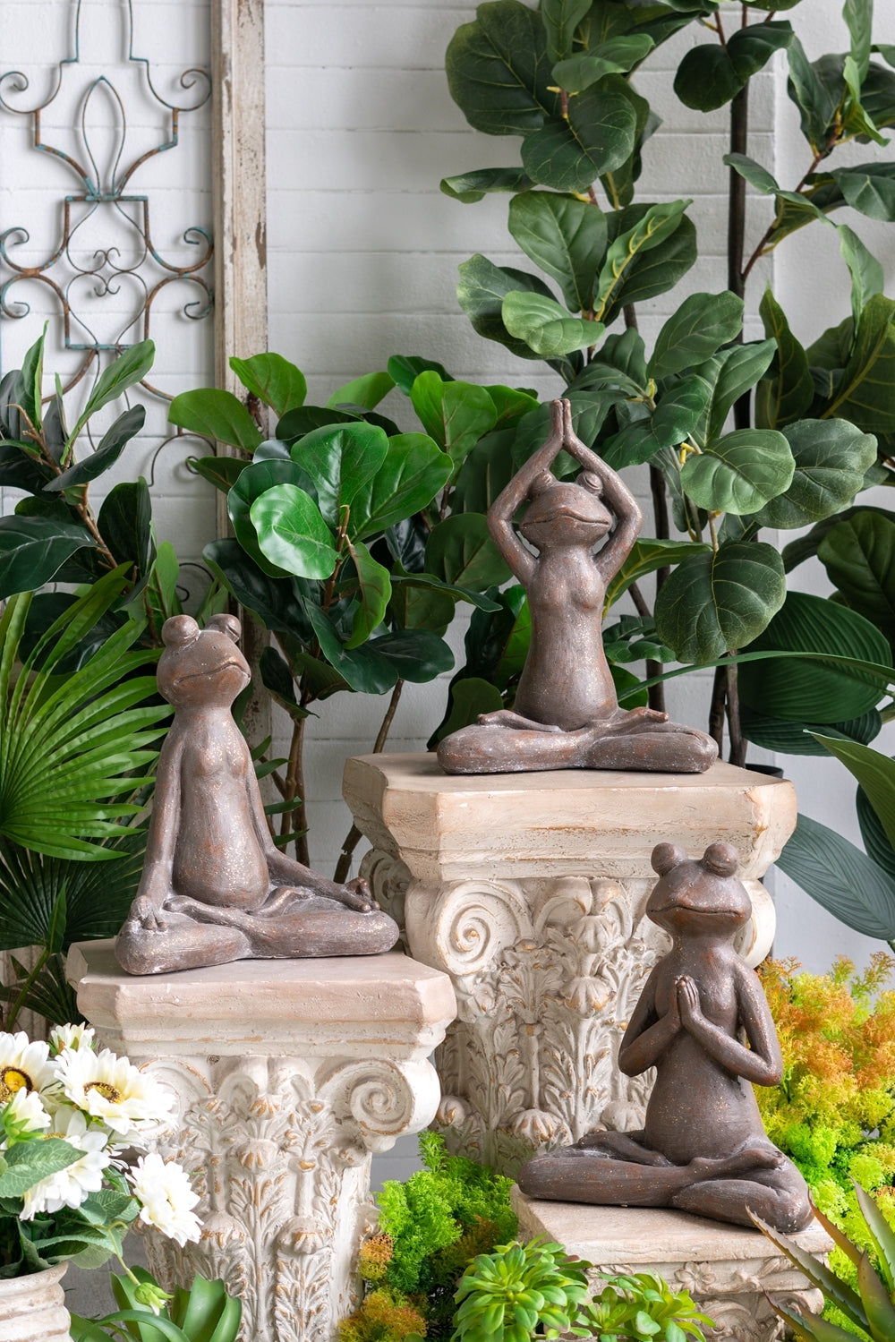 This decorative frog figurine, crafted from magnesium oxide, features a calming namaste pose ideal for enhancing living spaces or outdoor patios with a playful yet serene vibe.