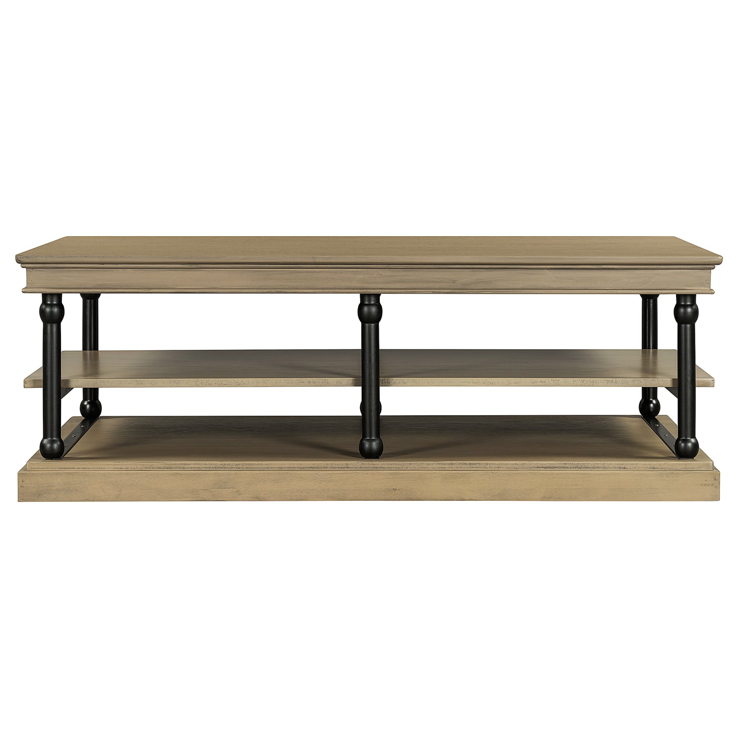 55.1' Wood Coffee Table with Black Legs, 2 Open Storage Shelves, Brown