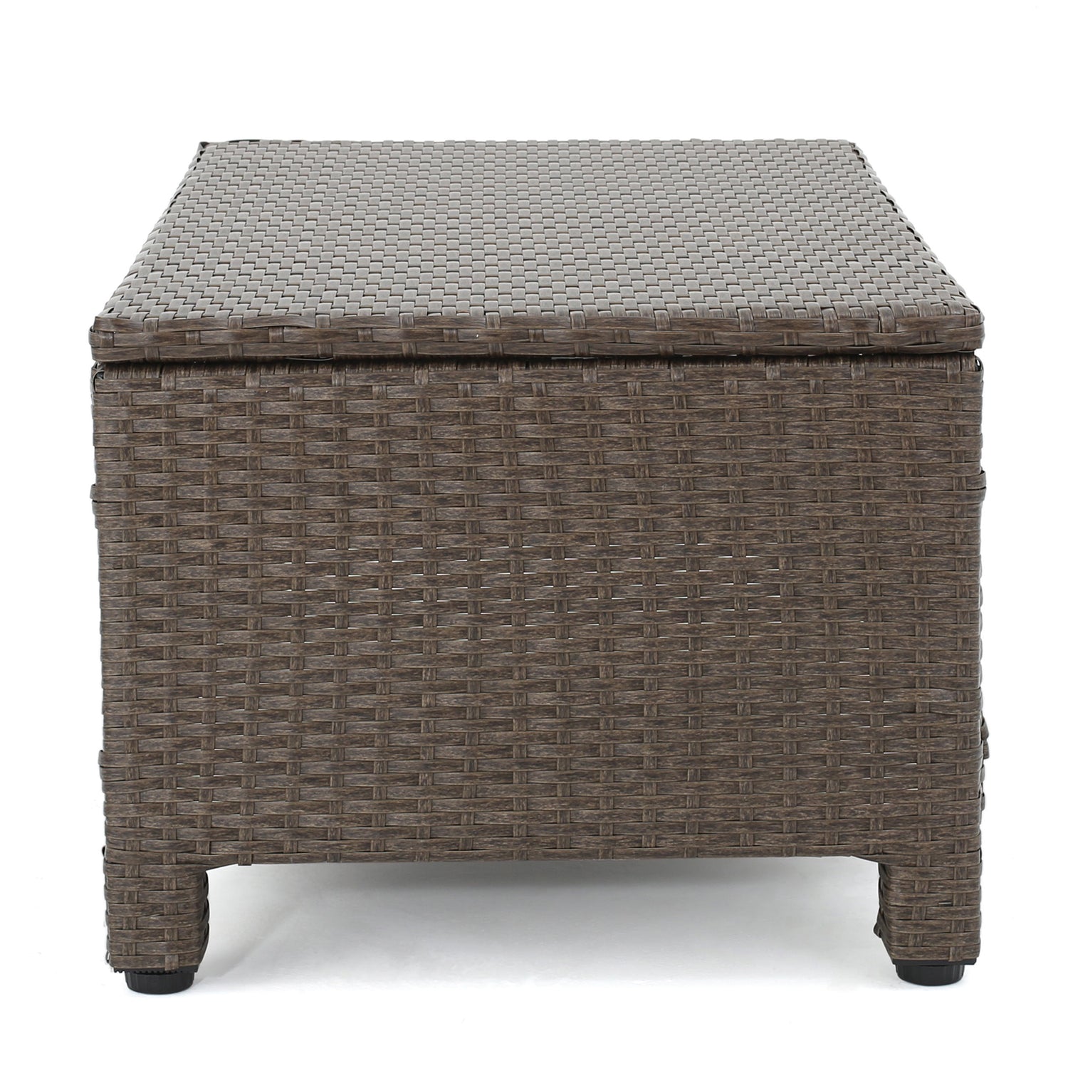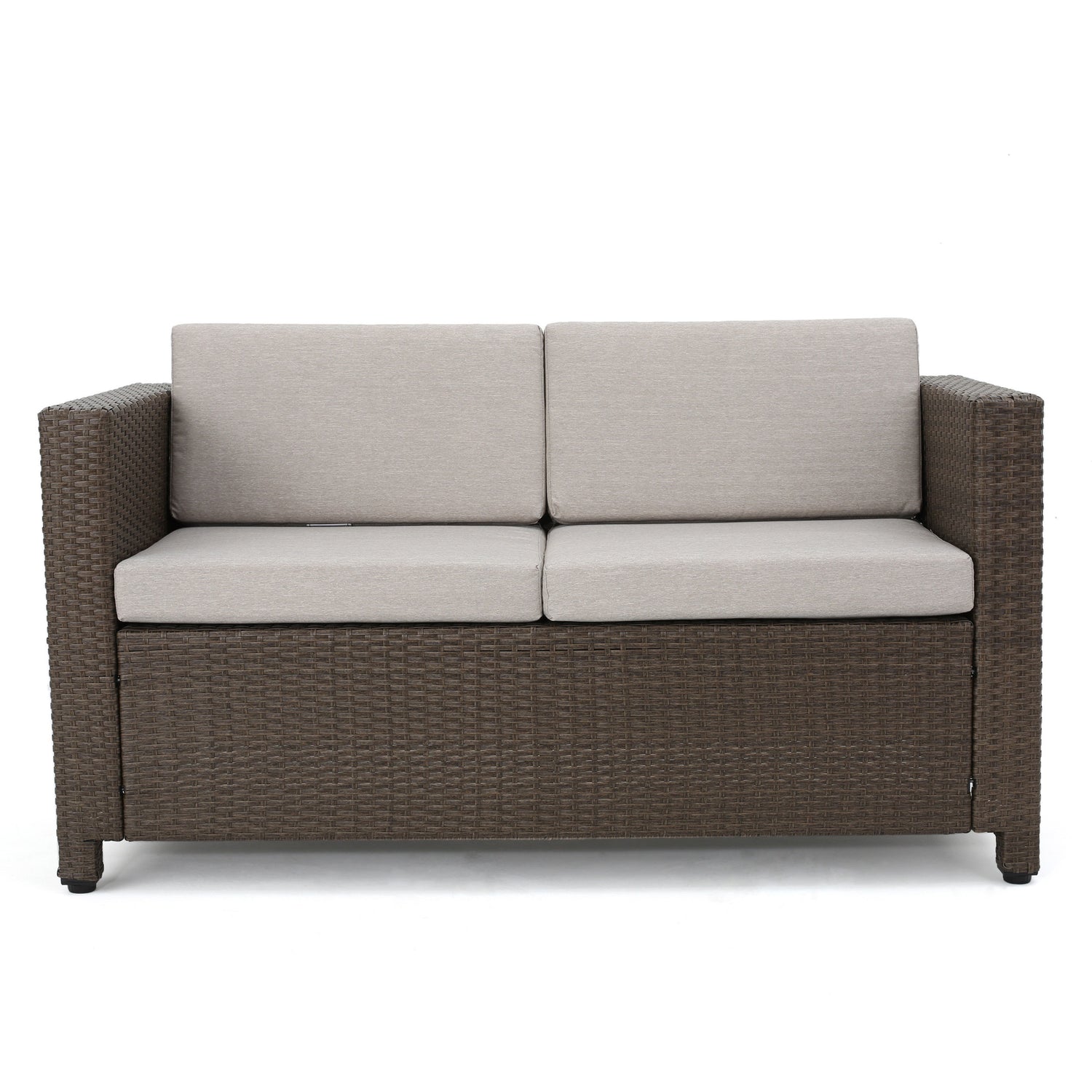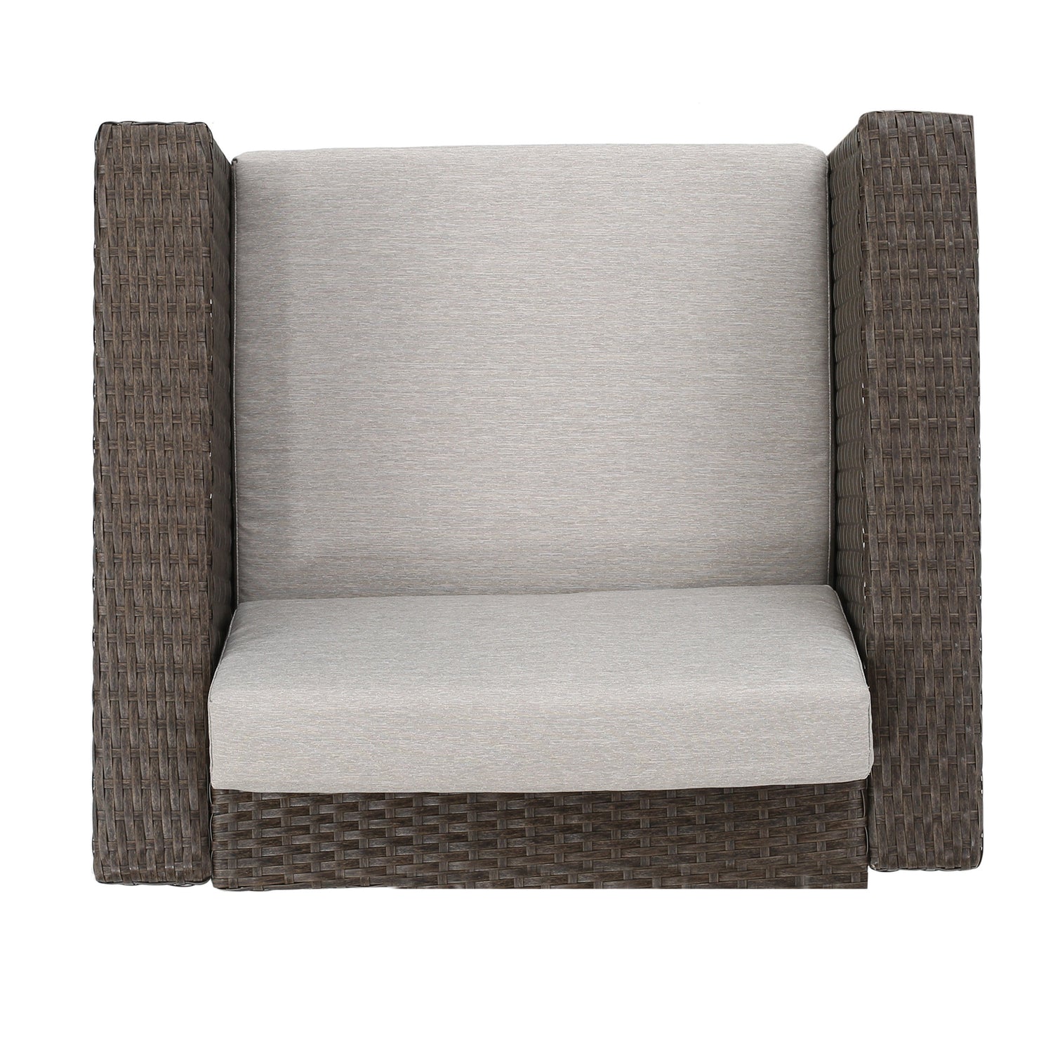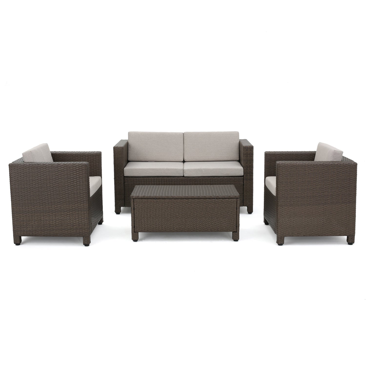- Complete with one loveseat, two club chairs, and one rectangular coffee table, this seating group shows off PE wicker rattan wrapped around an all-weather, water-resistant iron frame.