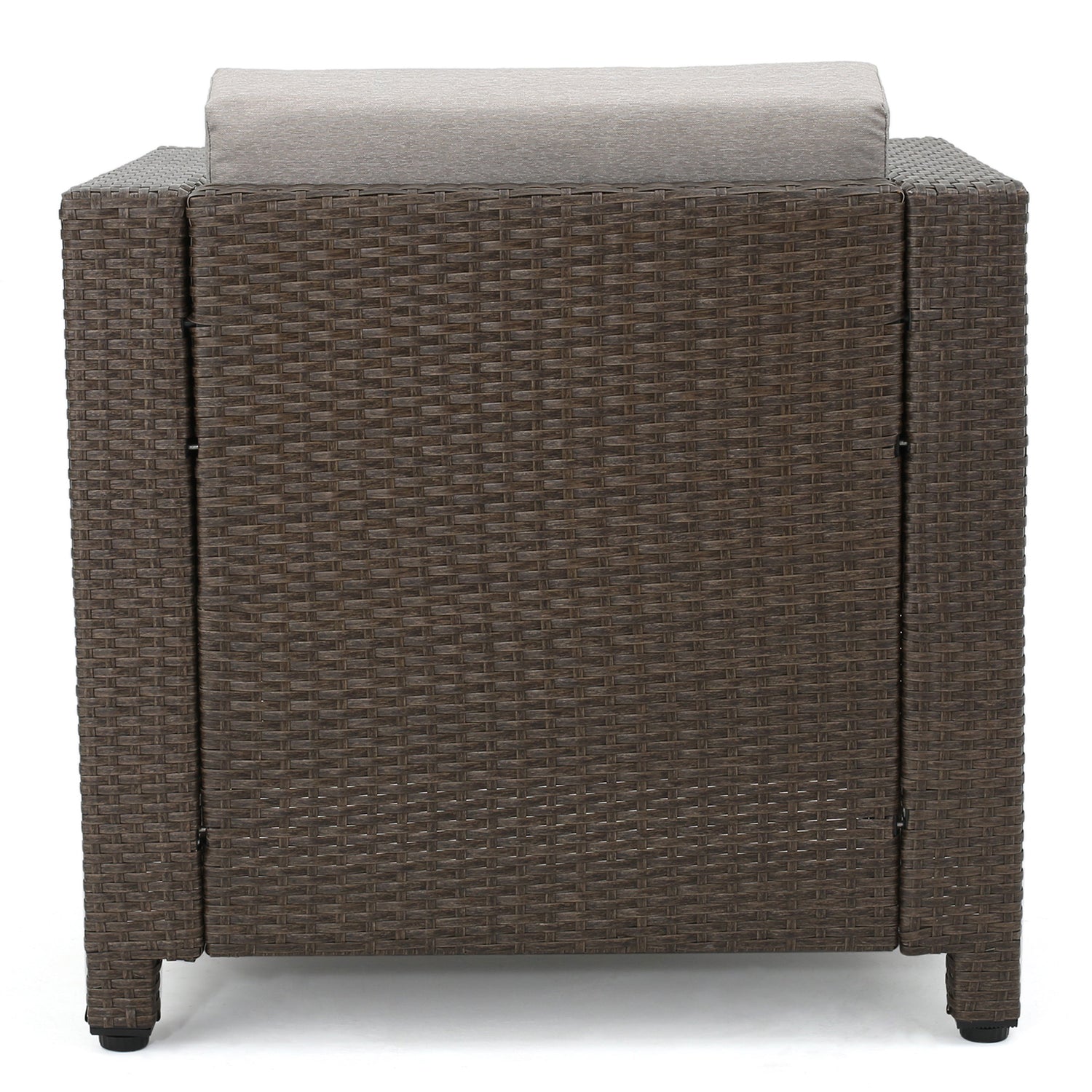 - Foam-filled cushions with polyester-blend cover top each seat and line the back, for plenty of padding as you unwind with a drink and a book. The cushions are also sewn shut, so take care when spot-cleaning.