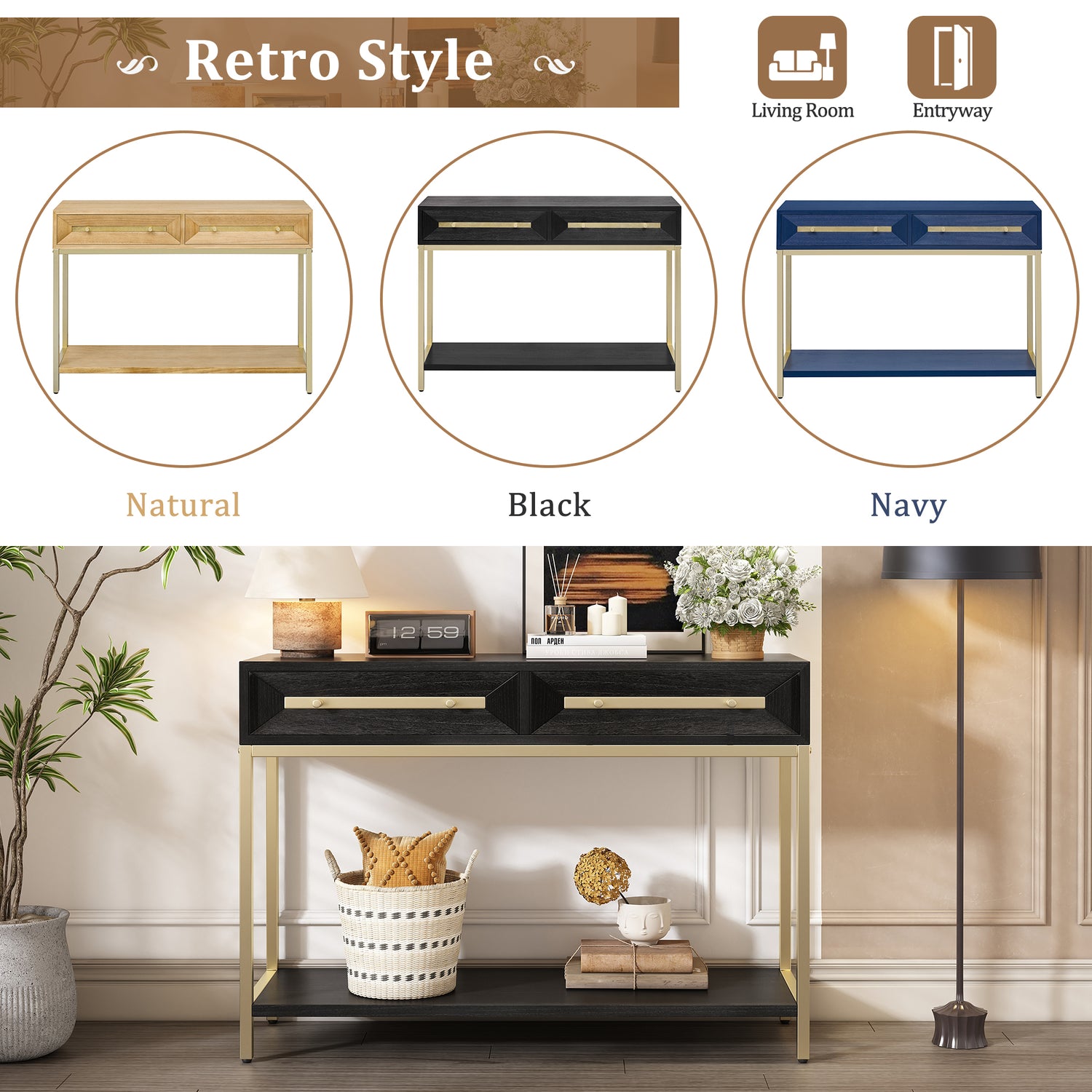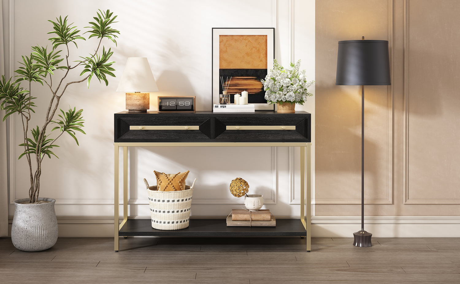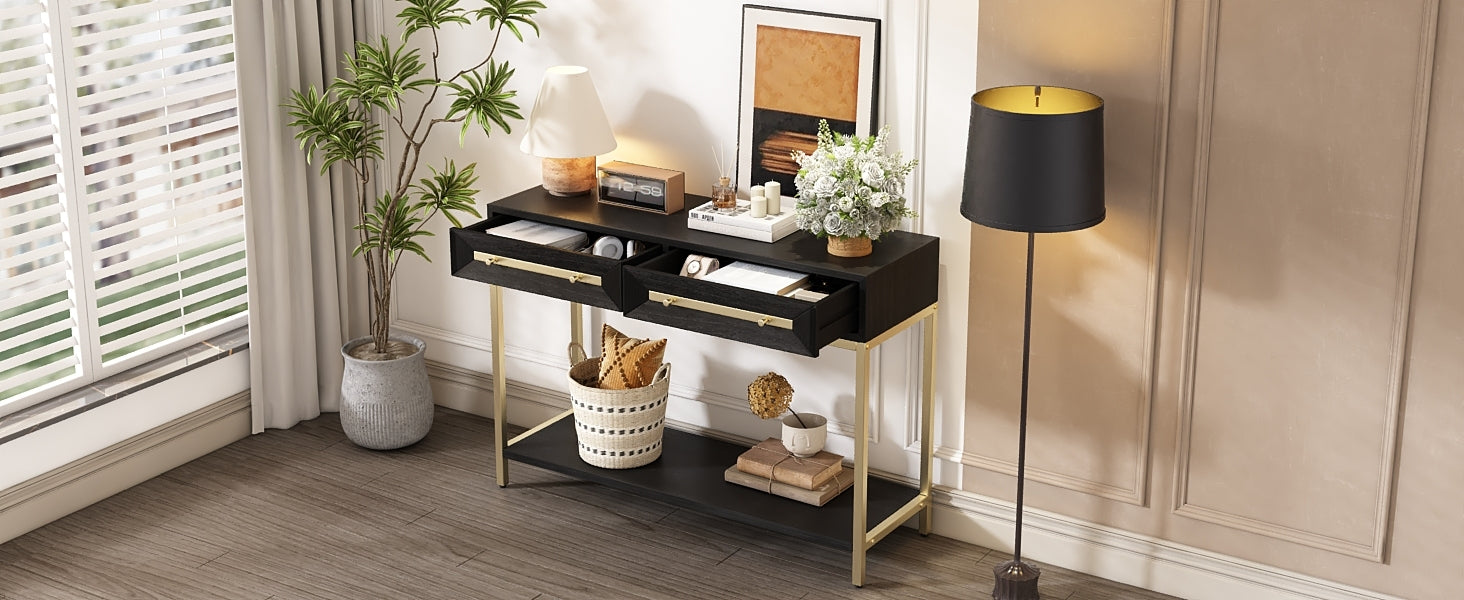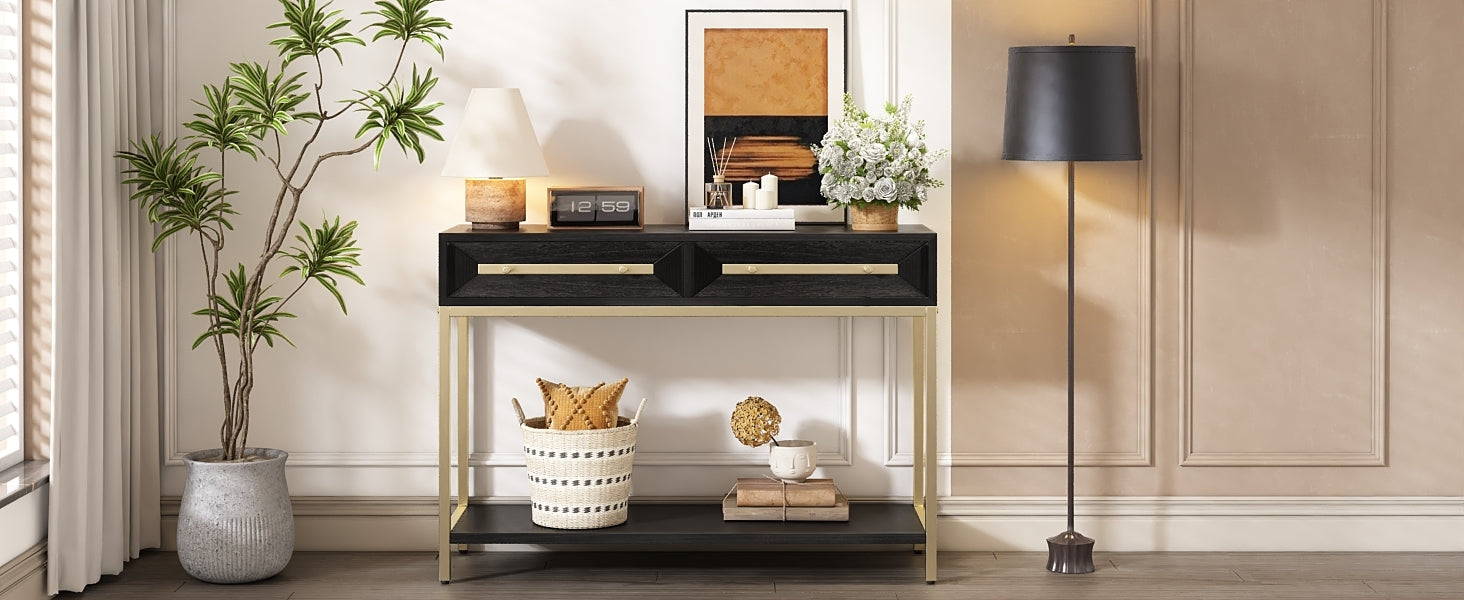 - Retro Style: Featuring a sleek black finish, clean lines, and refined gold-tone accents, this entryway table blends modern elegance with timeless appeal. Its minimalist design seamlessly complements vintage, transitional, or modern interior styles, making it an ideal choice for your hallway or living room as a sofa table or console table.