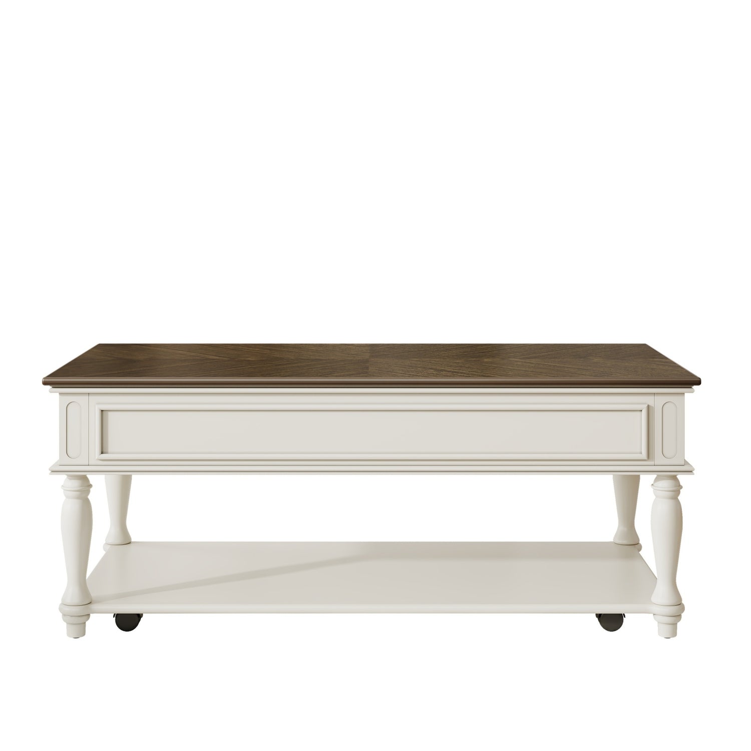 This mid-century coffee table showcases a classic appearance with wood spindle-shaped legs, finely crafted trim panels, and retro dark brown handles, adding authentic farmhouse charm to your home decor. Its retro and elegant look pairs with most furniture and decor, fitting well in both small and large living spaces.