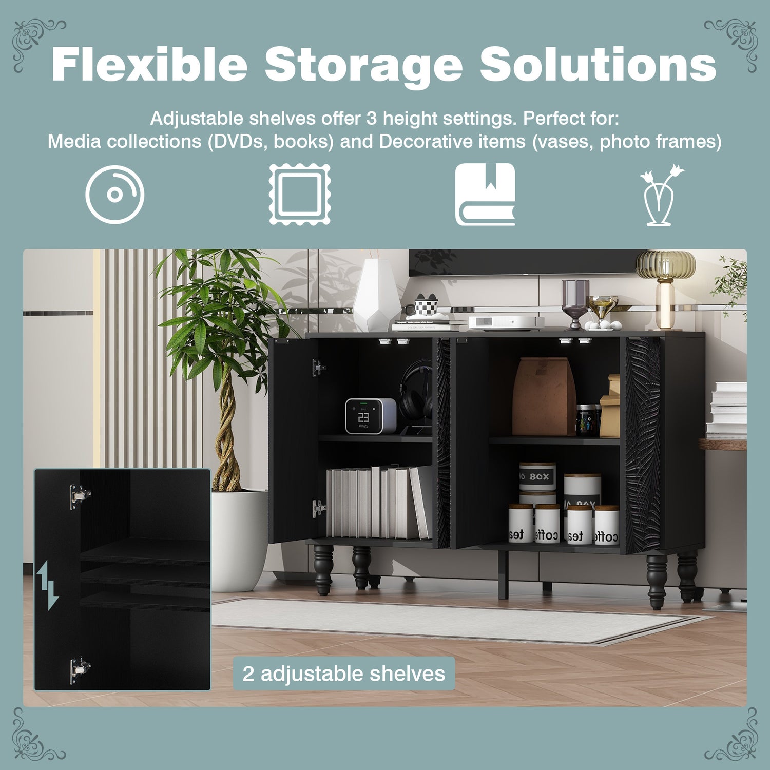 - Including 2 spacious cabinets and cabinets, you will find two adjustable shelves, offering three different height options and multiple storage solutions. This flexibility allows you to customize the interior according to your storage needs. Whether you need space to place taller electronic devices such as gaming consoles or sound systems, or smaller items such as DVDs, books, and decorations, adjustable shelves can easily create the perfect configuration.