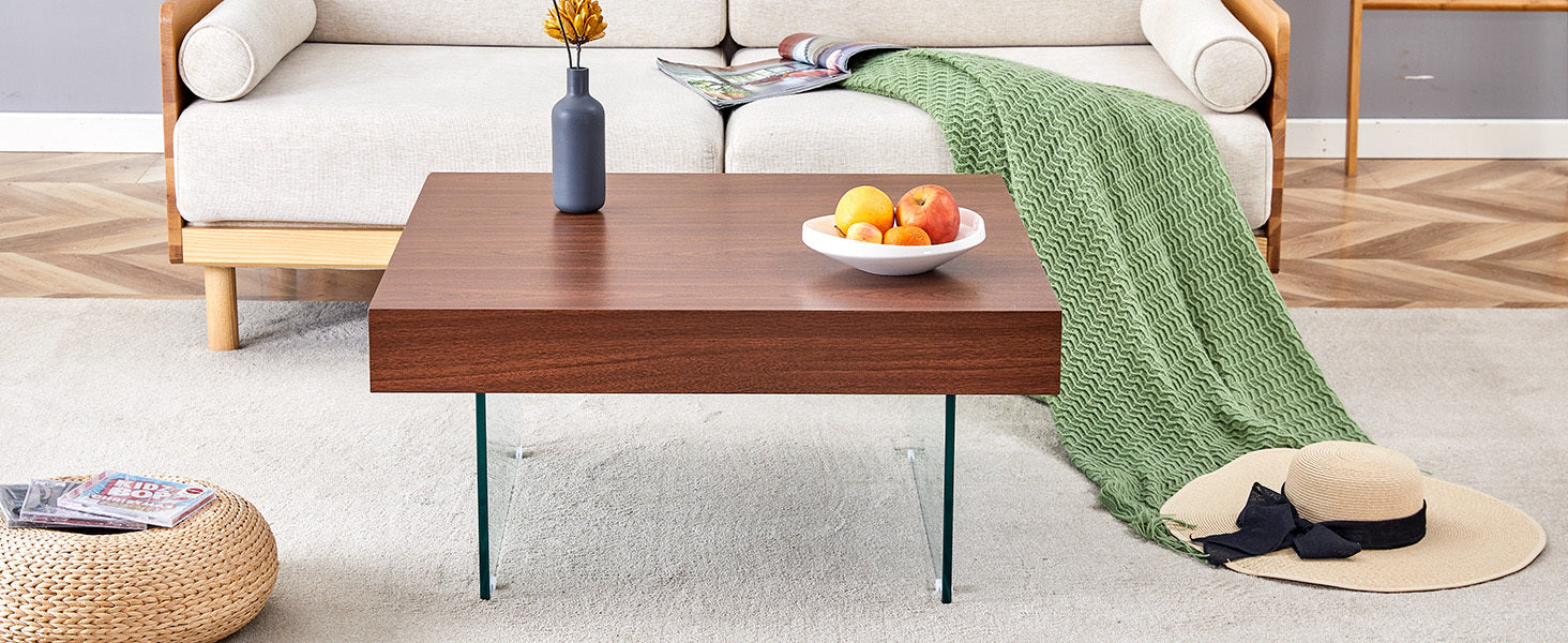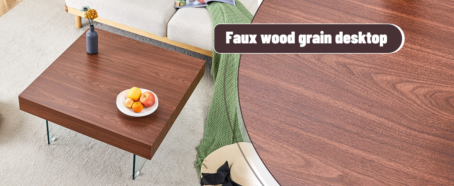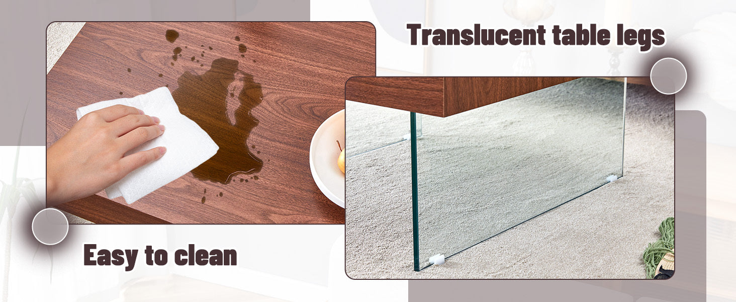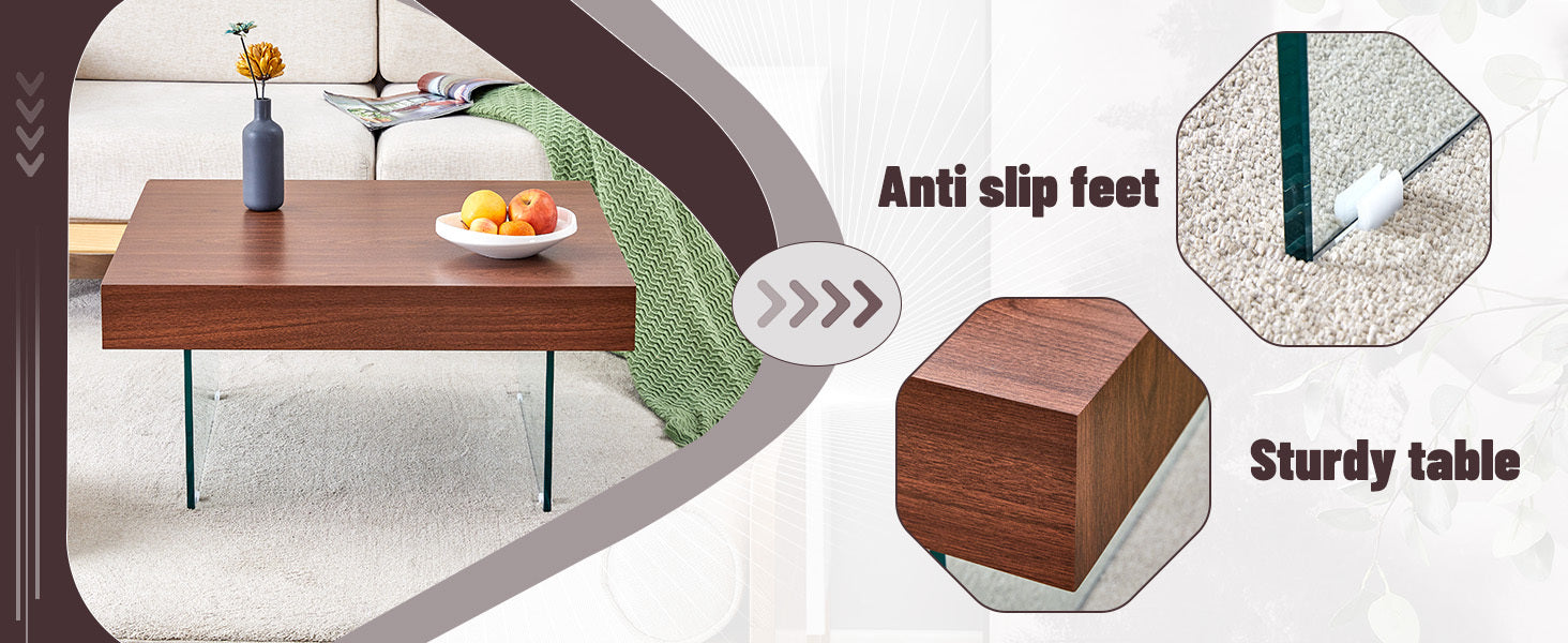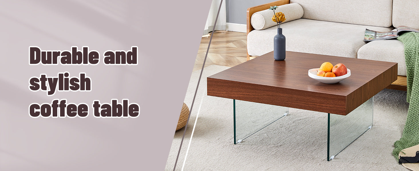 - This coffee table will be the finishing touch to your home decor. Made of high quality density board. The surface is covered with beautiful stickers. The uniqueness is the design of the glass legs, but also gives the coffee table a modern and minimalist aesthetic.