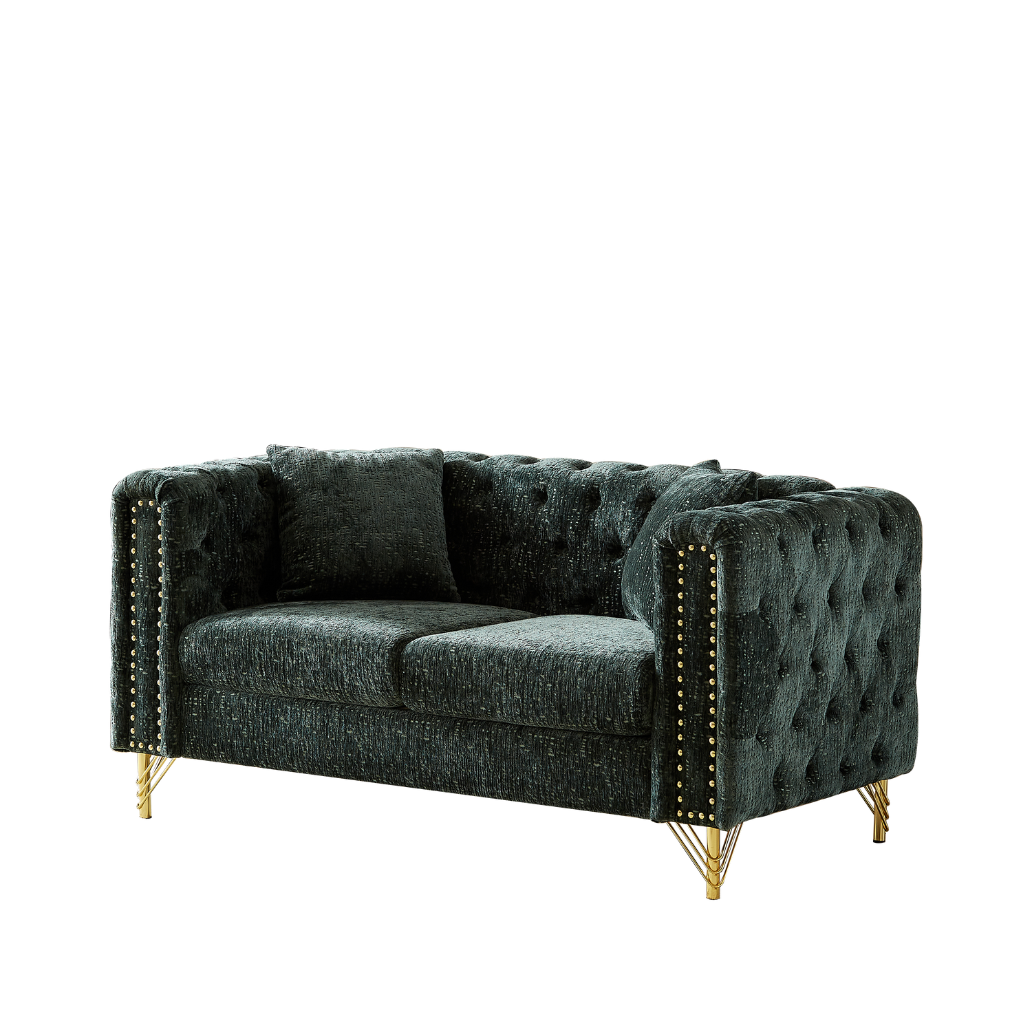 - ✔ Sturdy and durable. The sofa's frame is made of solid wood for added sturdiness and durability. With comfortable foam, soft cushions supported by a curved spring structure, metal legs for years of use, and tufted buttons on the back and arms, this sofa is perfect for those who want to rest after a busy day.