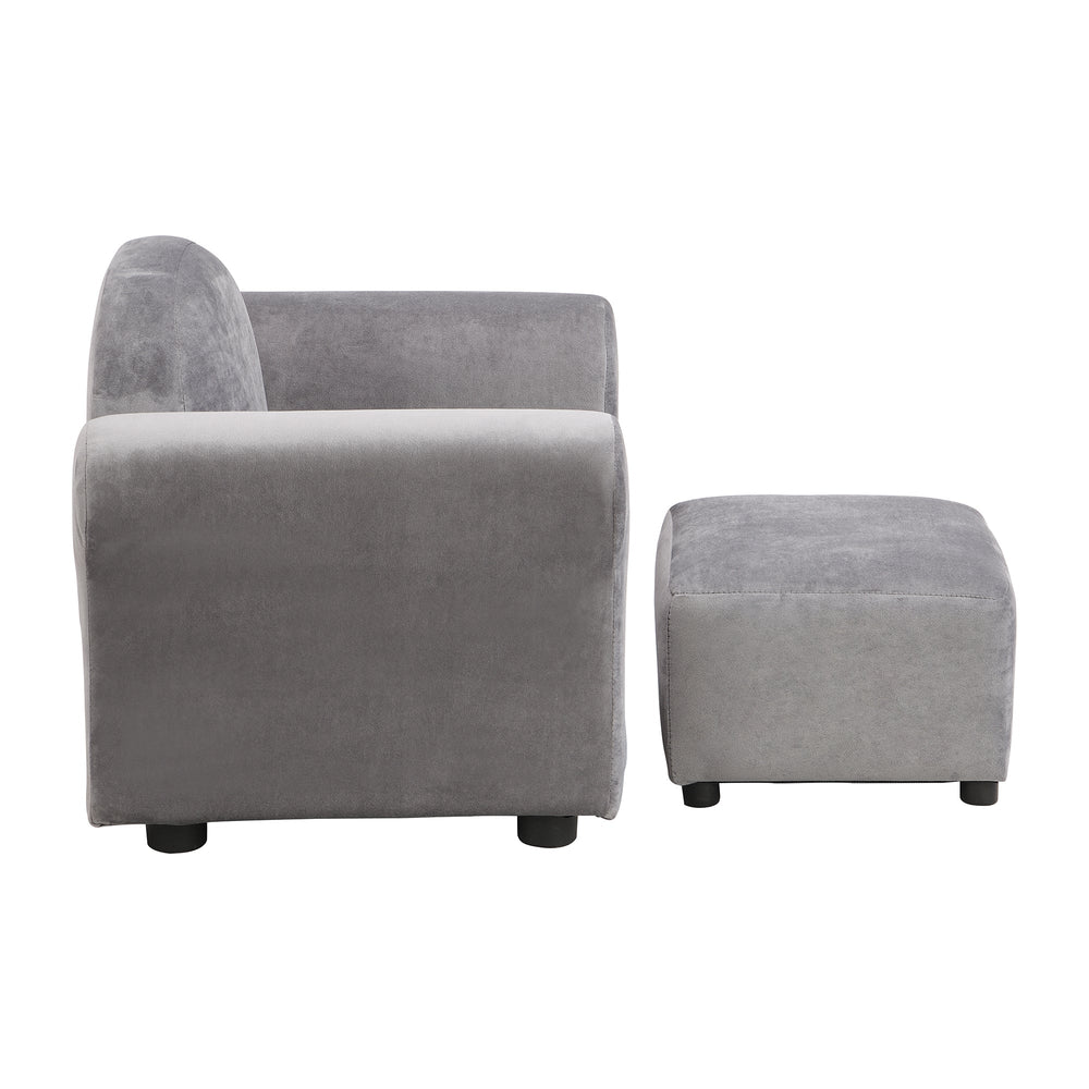 This kids gray velvet upholstered chair with ottoman is designed for bedrooms, playrooms, or living areas. It combines comfort and style in a compact, kid-friendly size.