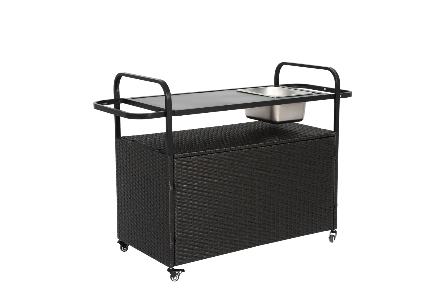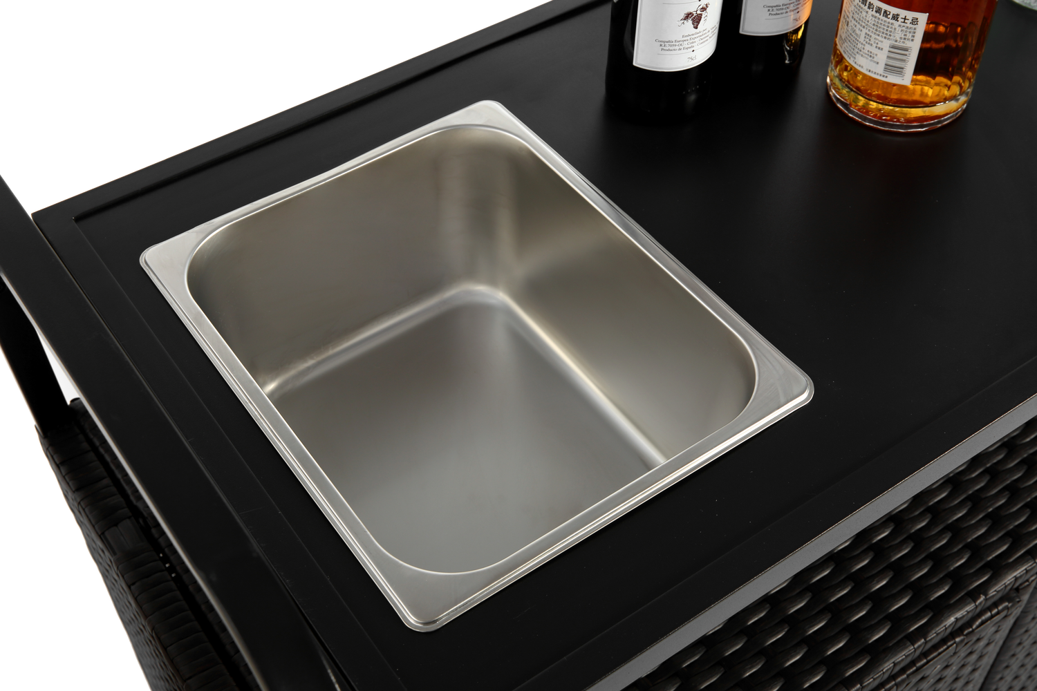 This outdoor bar table combines functionality and style, perfect for garden, poolside, or backyard entertaining. It features a wicker bar cart with a steel top, ideal for serving and storage in outdoor spaces.