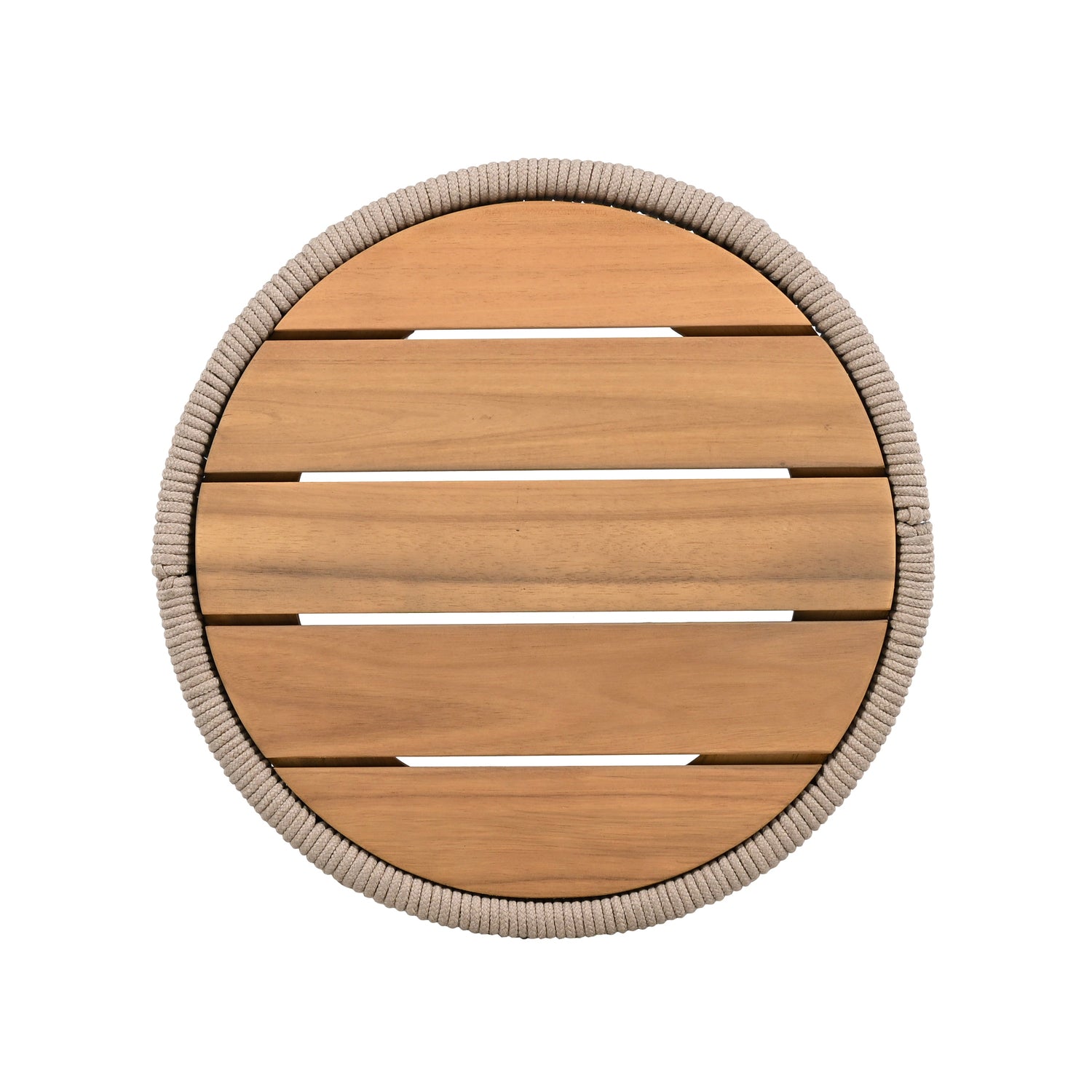 - Constructed of Acacia wood, powder-coated natural iron frame, and weather-resistant rope