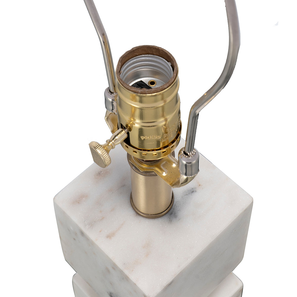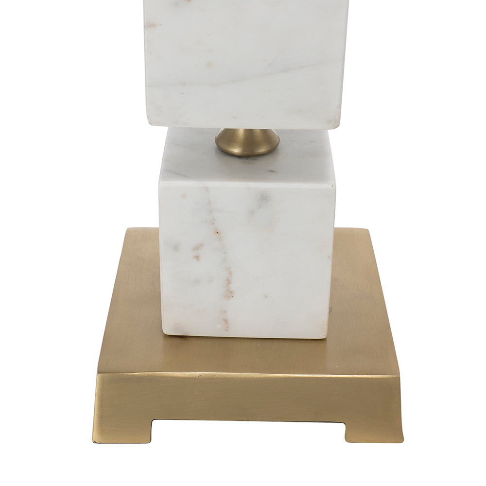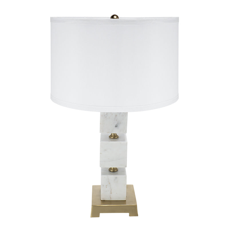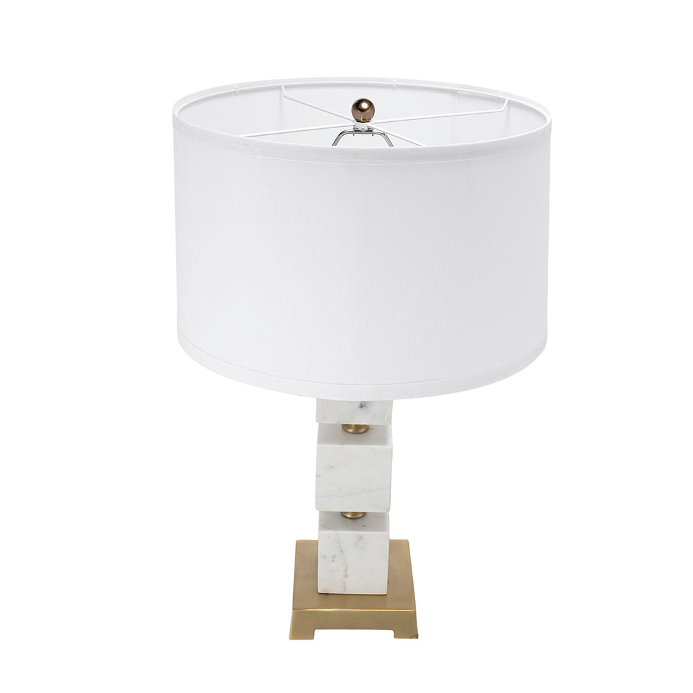 - Showcasing a classic white drum shade, three marble cubes with intervening gold accents, and a gold aluminum pedestal base, this table lamp offers an unmatched blend of artistic and contemporary themes.