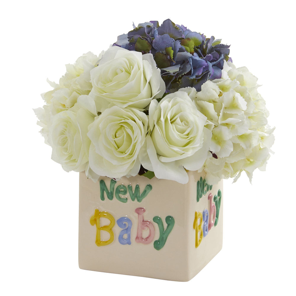 Bestow a faux-ever token of love to new parents with this artificial arrangement boasting a mixed collection of silk roses and hydrangeas, each boasting naturally occurring details in a palette of soft complementary hues. Perfect for displaying in a nursery, this quaint little arrangement stands 11” high from a decorative vase.