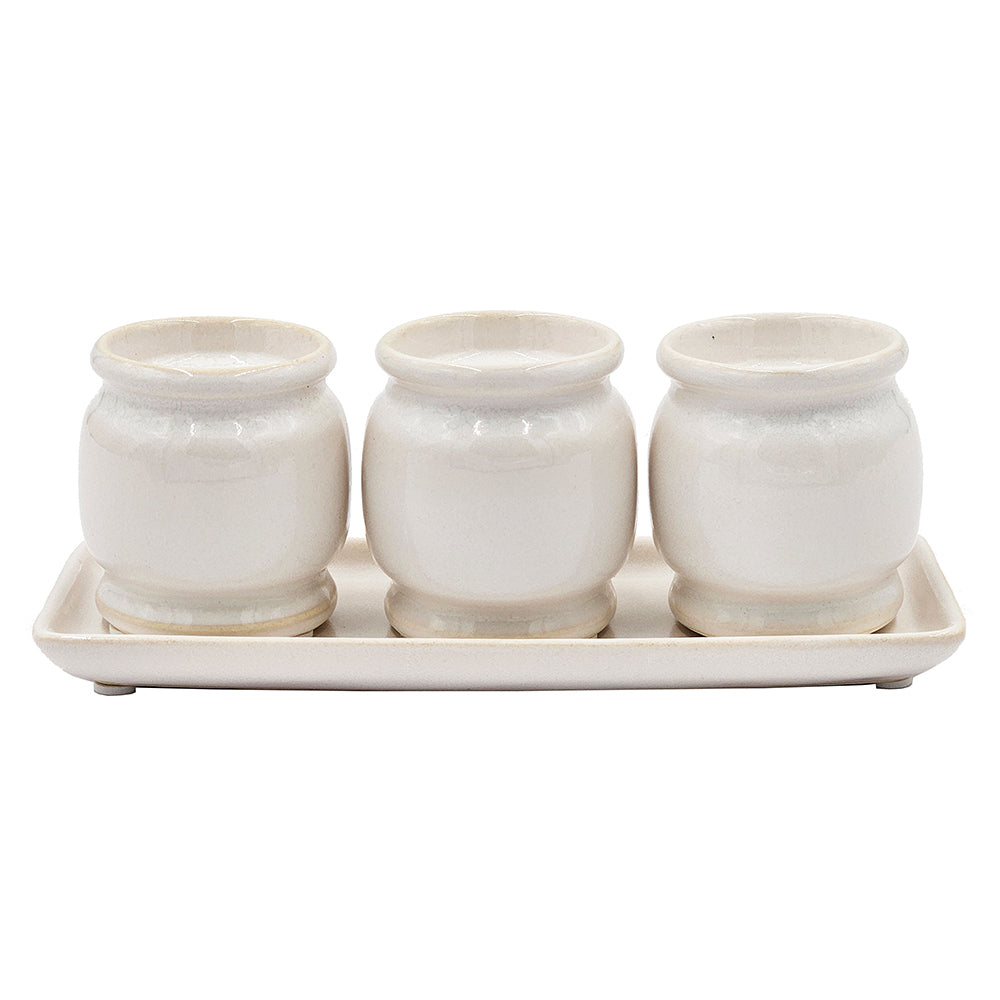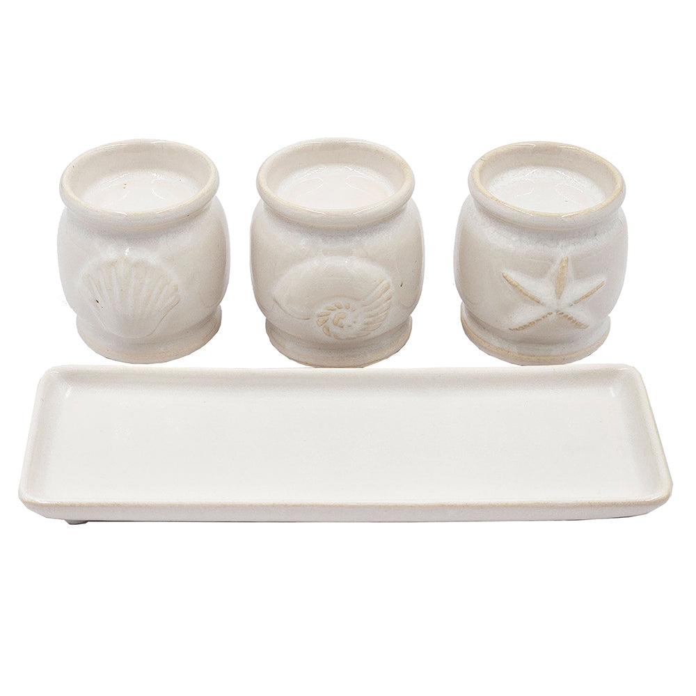 Create a trio of ambient light with this Three-Cup Tealight Holder. Made from 100% ceramic, this tealight holder comes in a sleek cream finish with seashell details. The tealight holder and tray is perfect for your beach house decor.