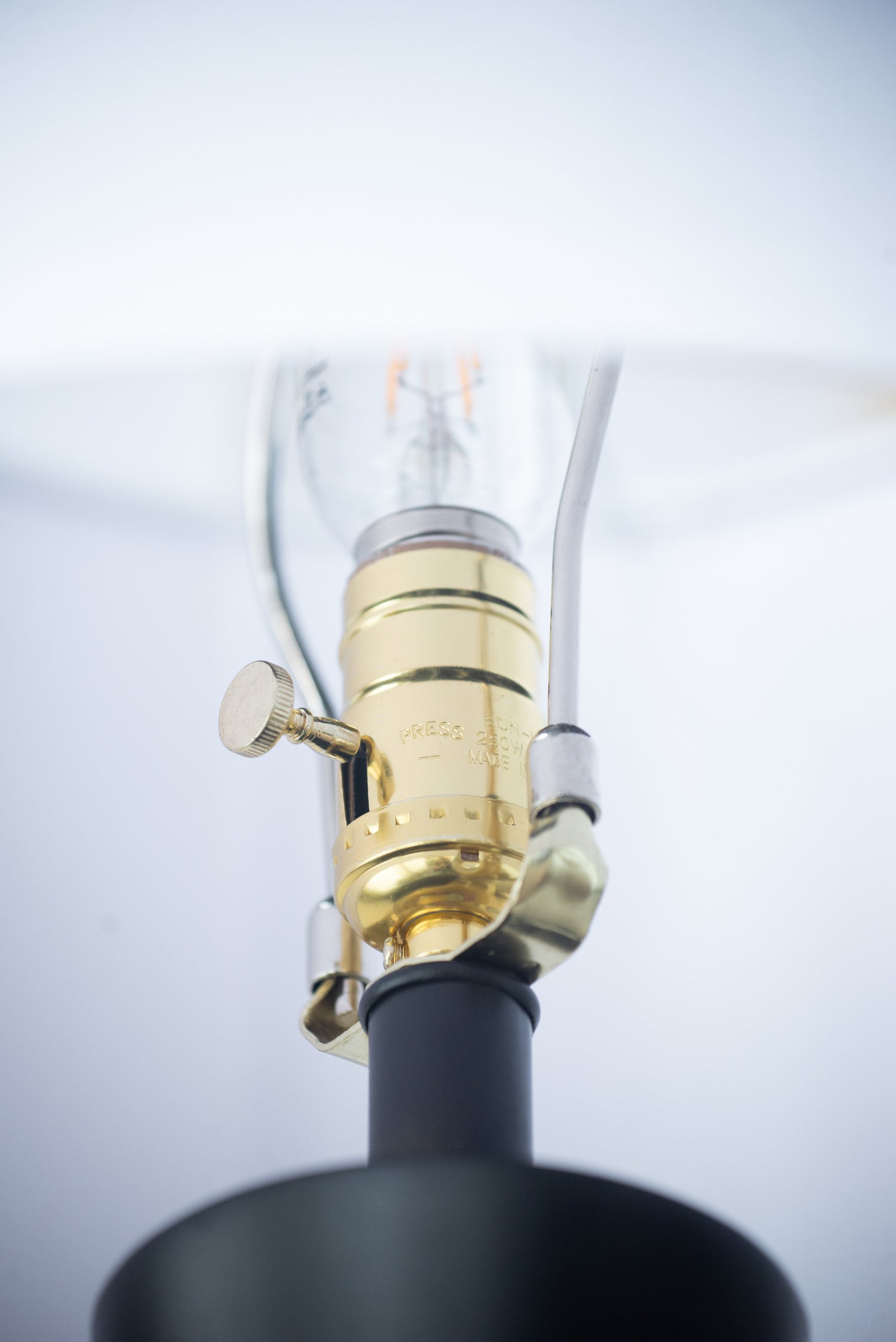 - Featuring an artistic silhouette with two discs in the center or of a unique body, a classic white fabric shade, and a sturdy aluminum construction with a sleek black finish, this table lamp offers both contemporary charm and intrigue in equal measure.