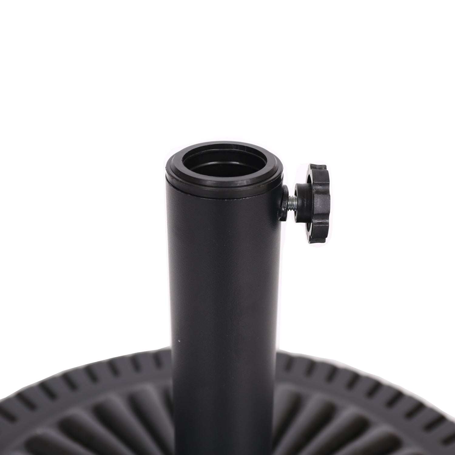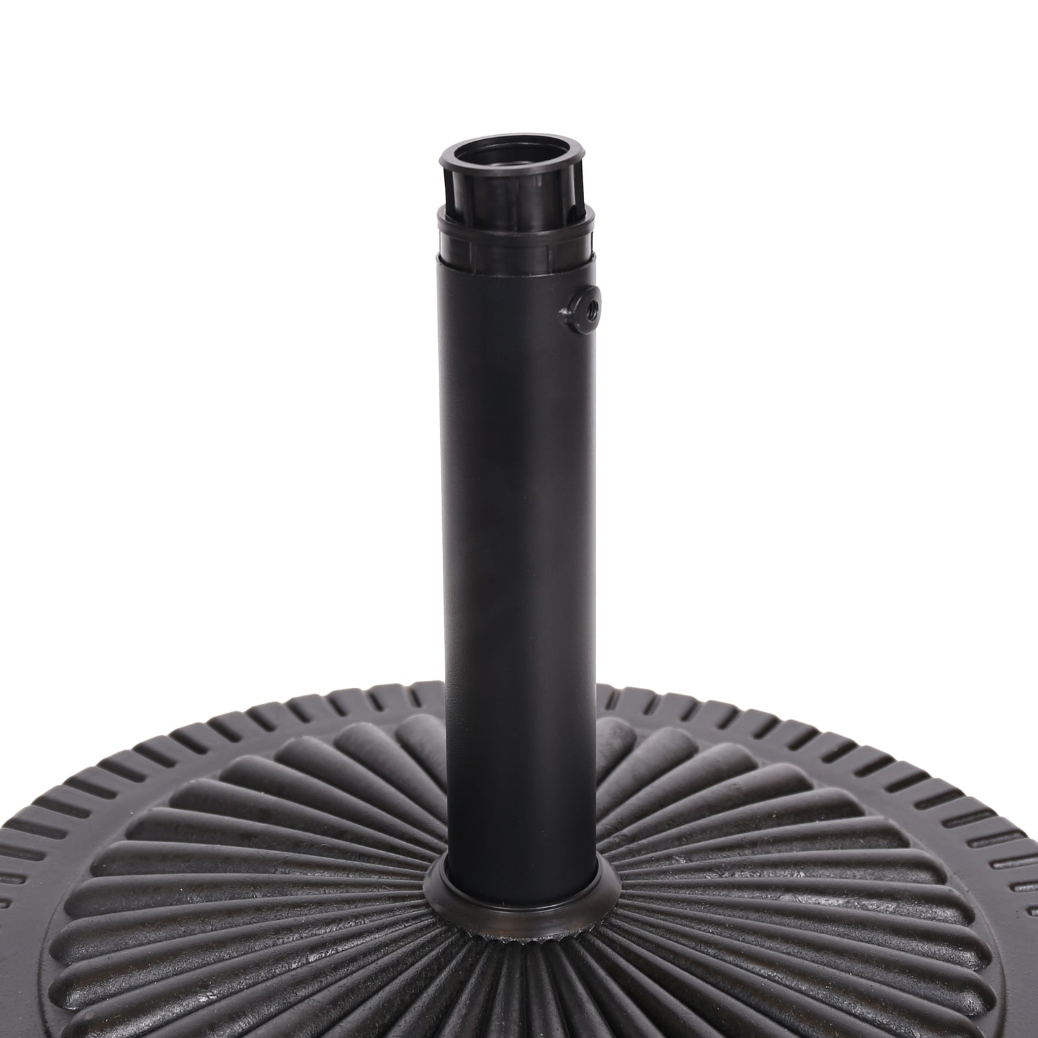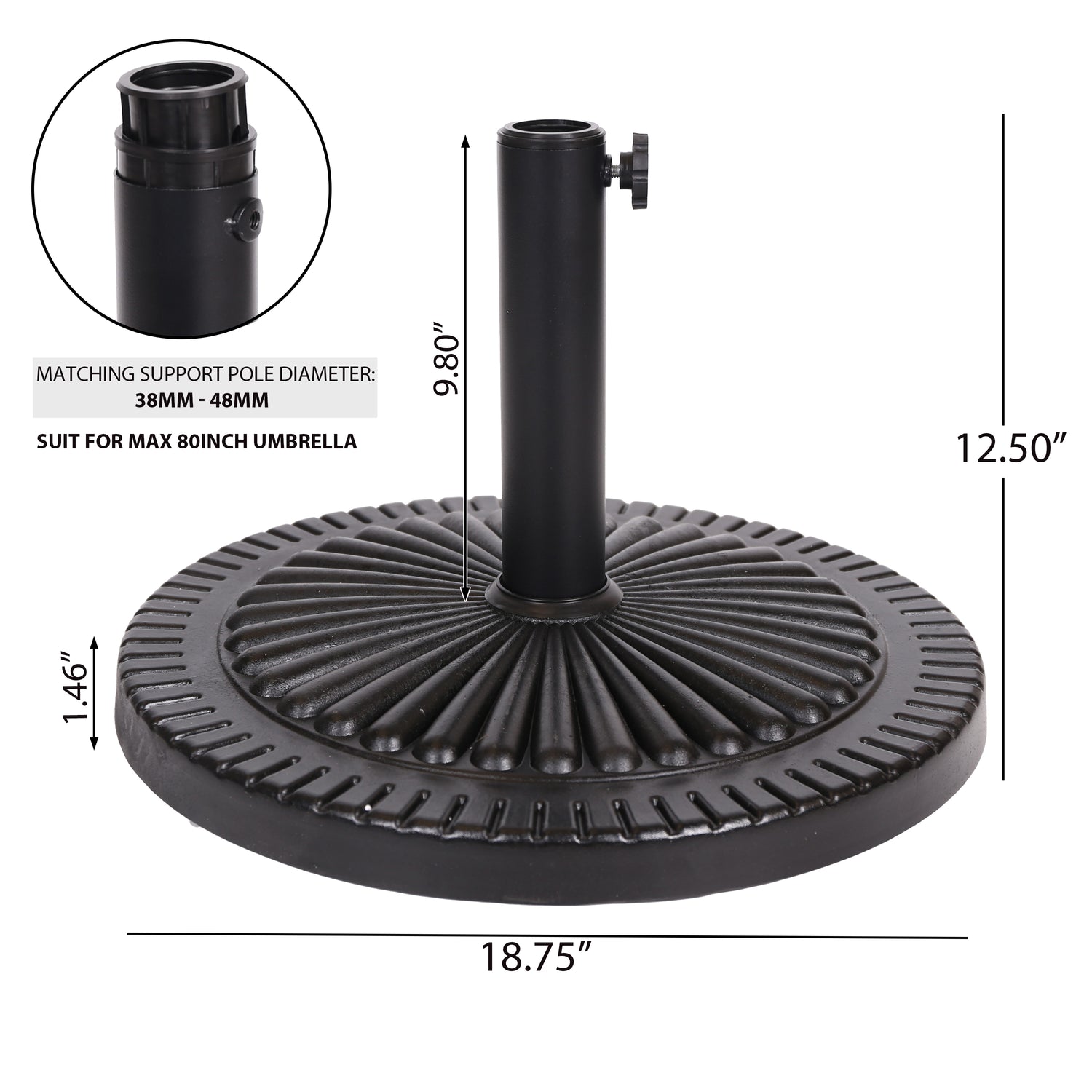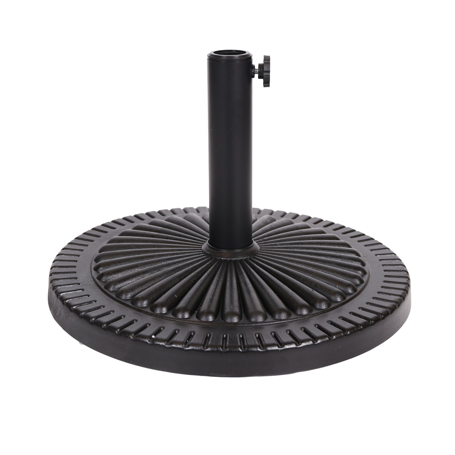 - Add some cool shade to your outdoor aesthetic by placing your favorite umbrella into this free-standing base, crafted from resin and metal. Its molded details add a dash of dimension to your decor, while its solid black finish is perfect set against a neutral floor for a complementing look.