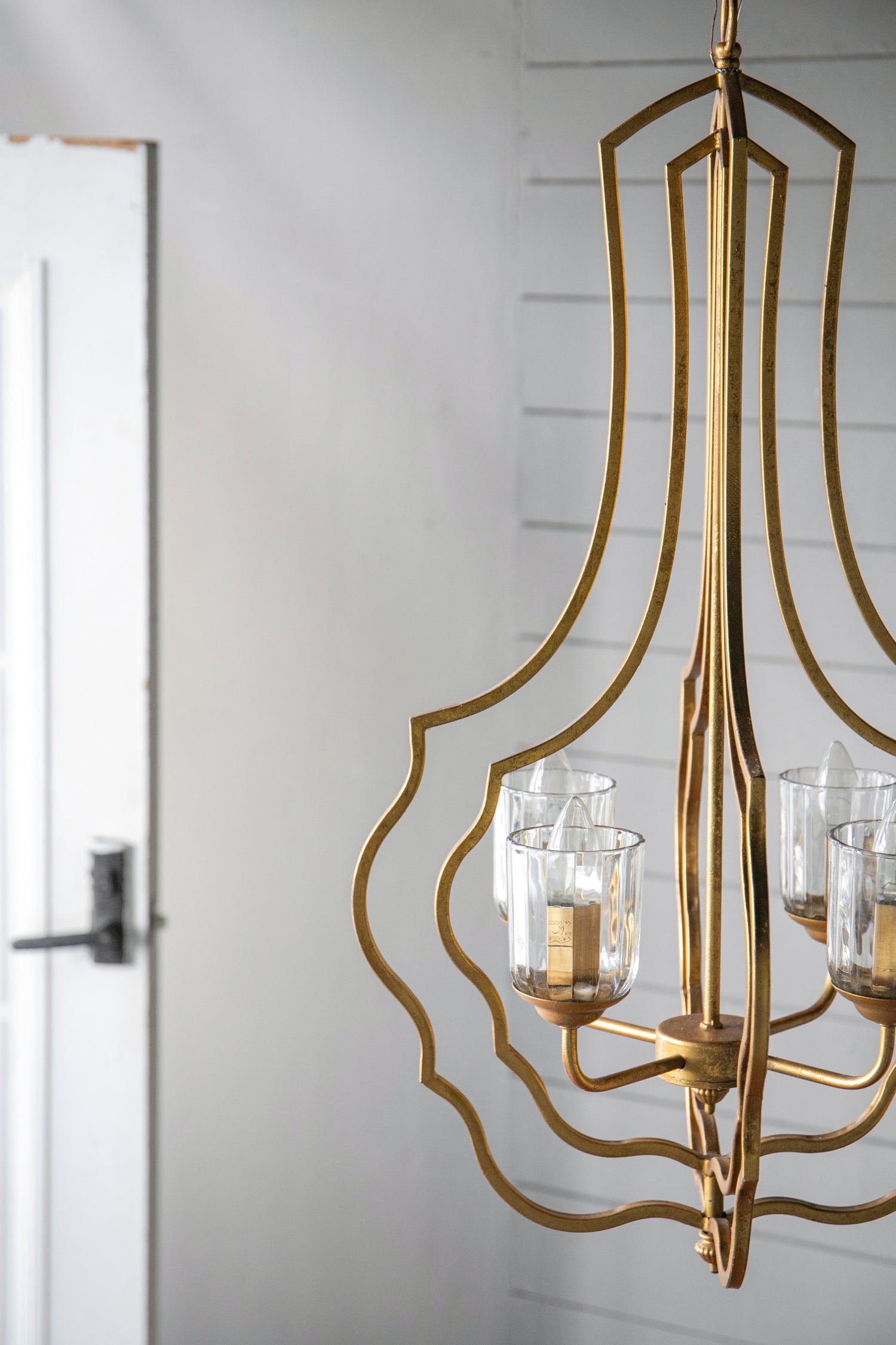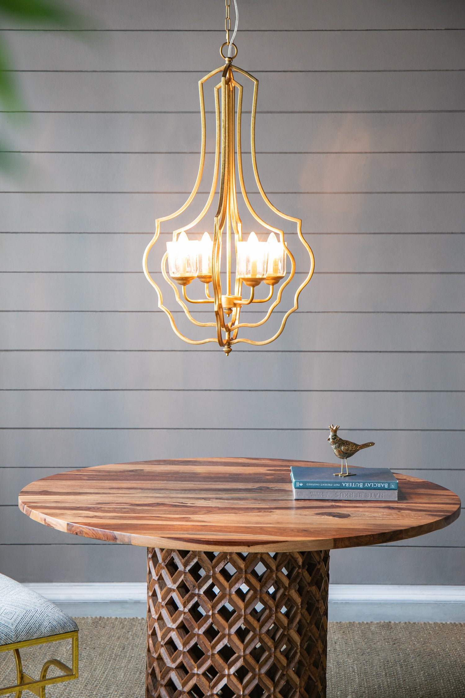 Brighten your interior with the exceptionally graceful Valerio Nested Chandelier. The sculptural metal frame with glass light covers makes a dramatic statement with its curves, angles, and antique gold finish. Outfit with four candelabra-style bulbs and hang anywhere that could use an elegant focal point.