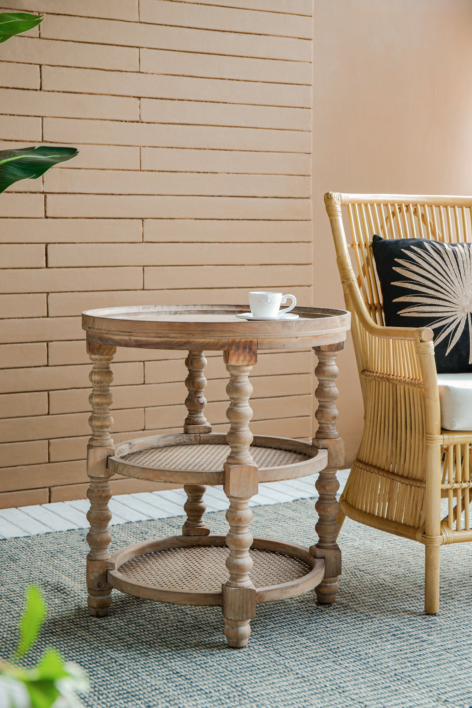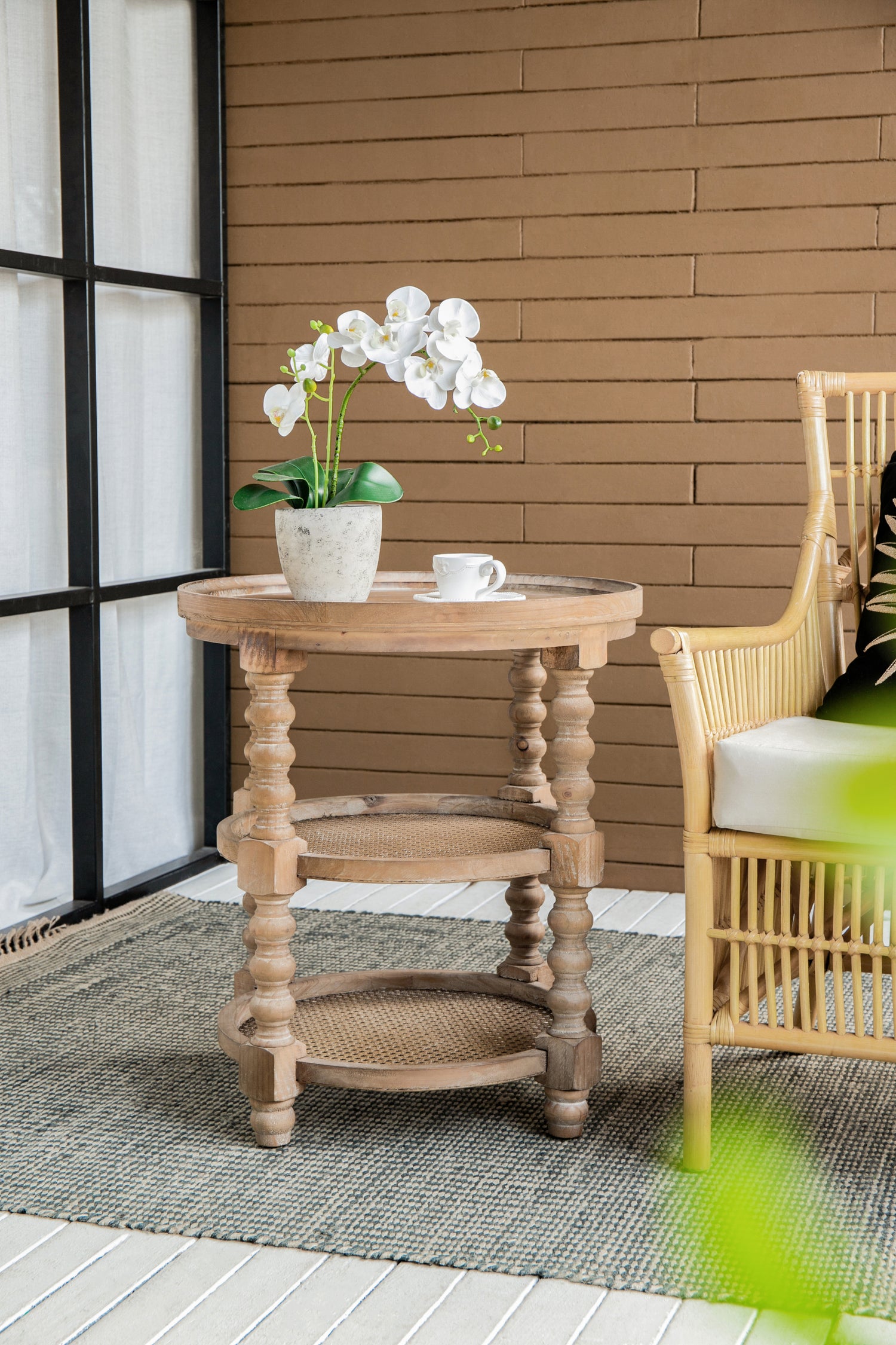 With its round, three-tiered silhouette, warm toffee brown finish, and two woven rattan shelves, this decorative side table will infuse your home decor with a classic style. Supported by turned legs, this piece showcases a truly unique silhouette that is sure to turn the heads of your guests whether it is placed in your living room, entryway, or bedroom.