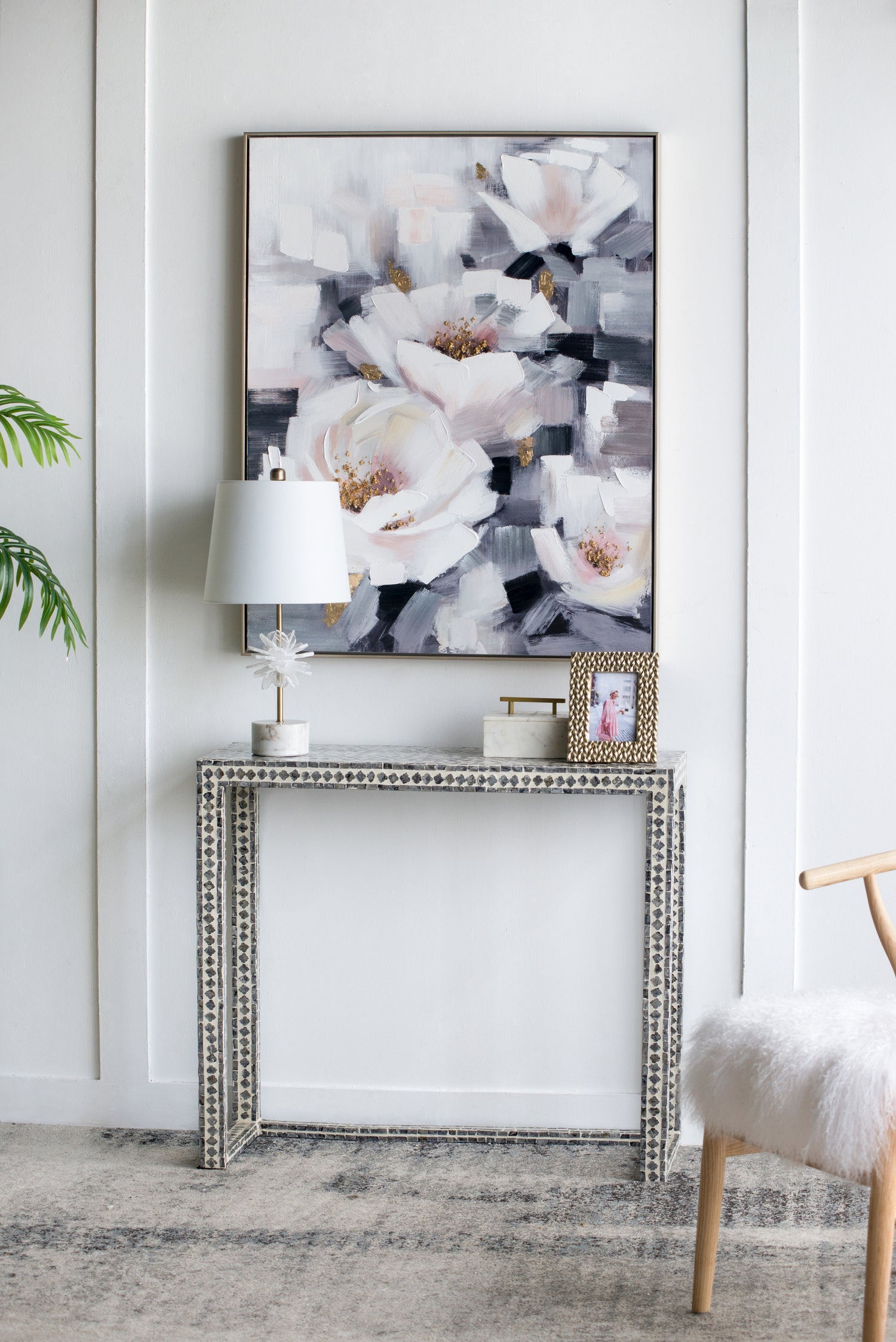 With its muted deep blue, ivory, and soft pink tones, the Sarah framed oil painting lends an air of understated elegance to any room. This hand painted oil on canvas is sufficiently subtle to create a sense of floral femininity and tranquility where you most need it. The graceful shapes and soothing tones blend easily into most any decor.
