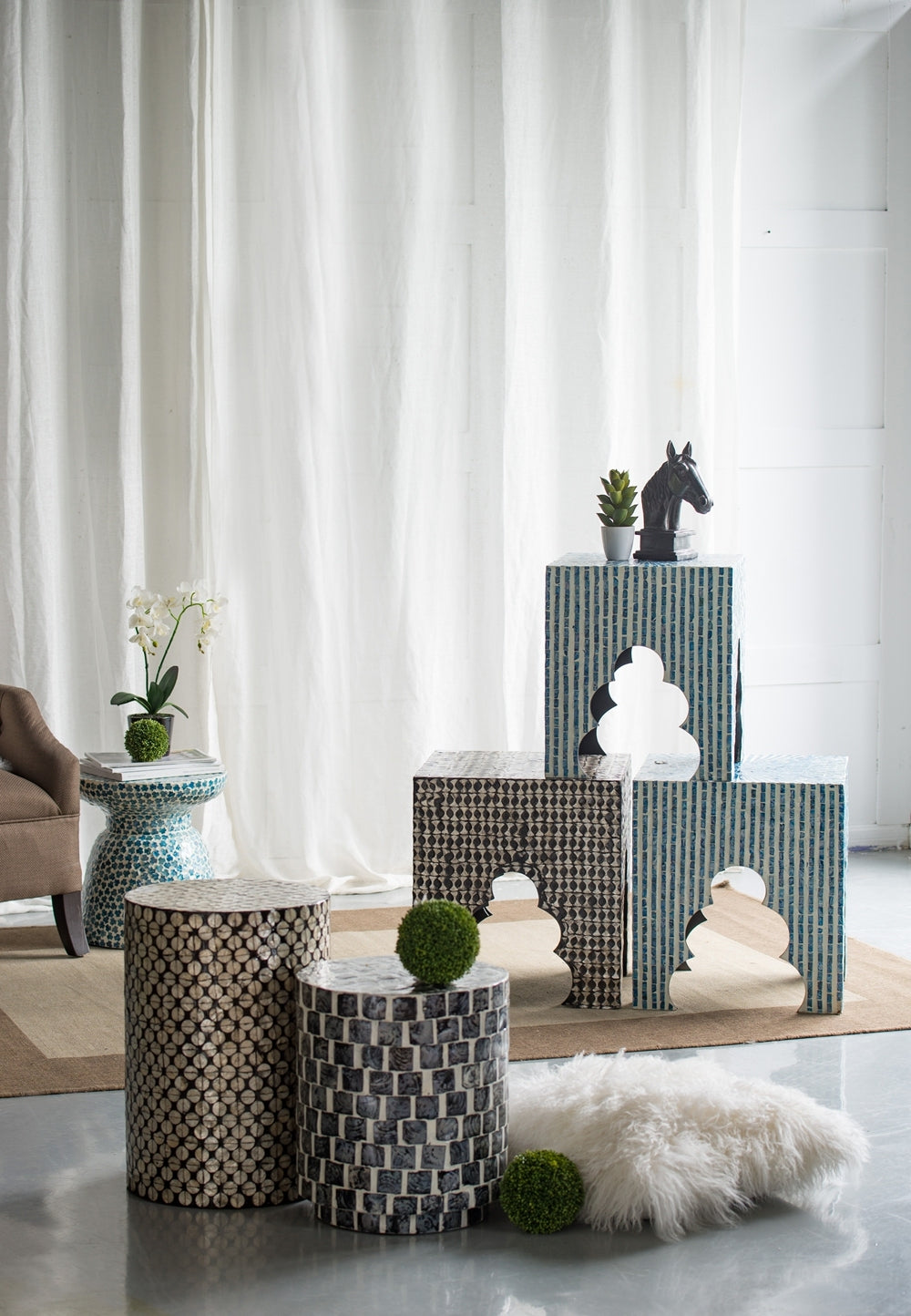 - A modern take on the classic drum silhouette, this stool features a striking black finish adorned with rich gold capiz shell patterns.