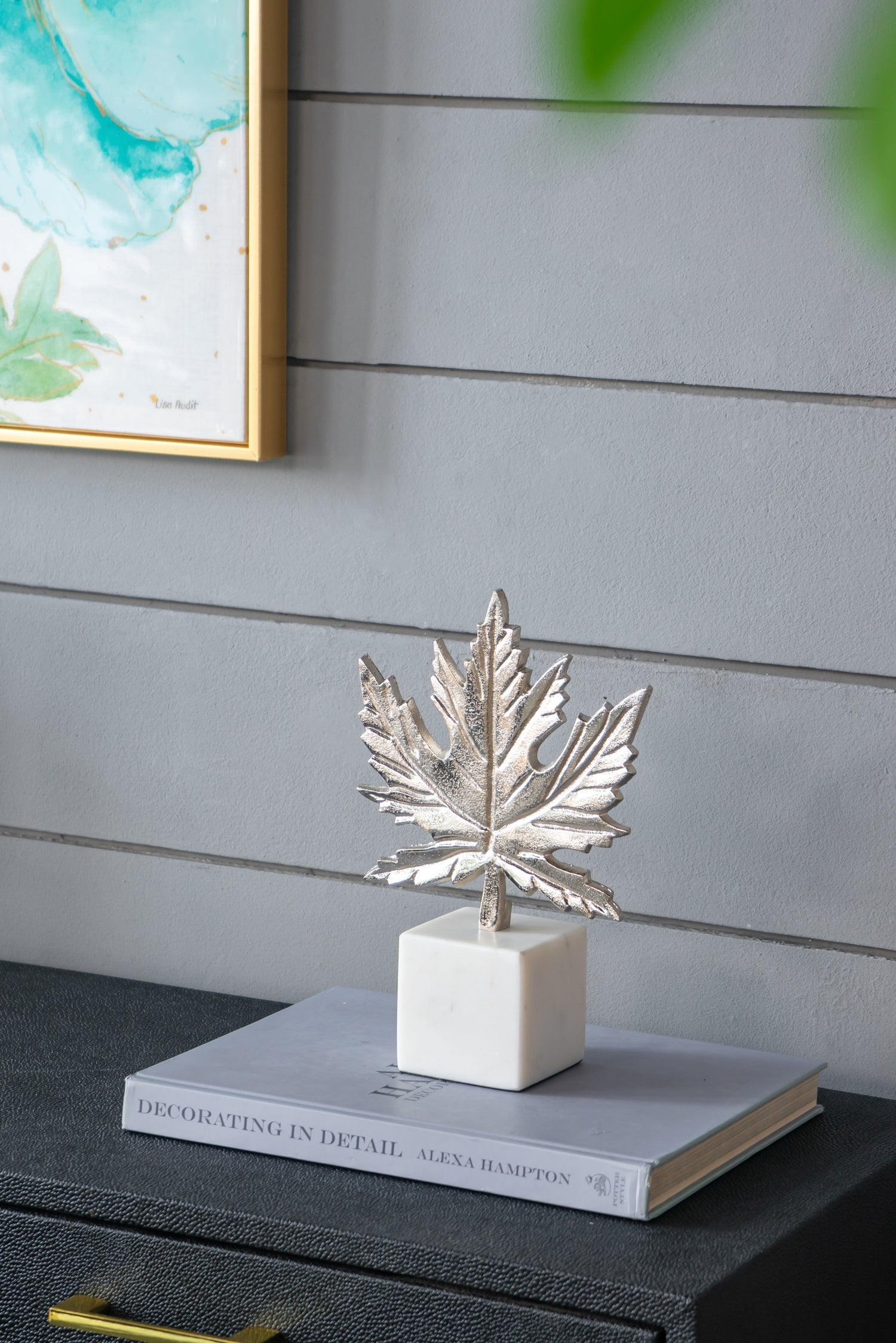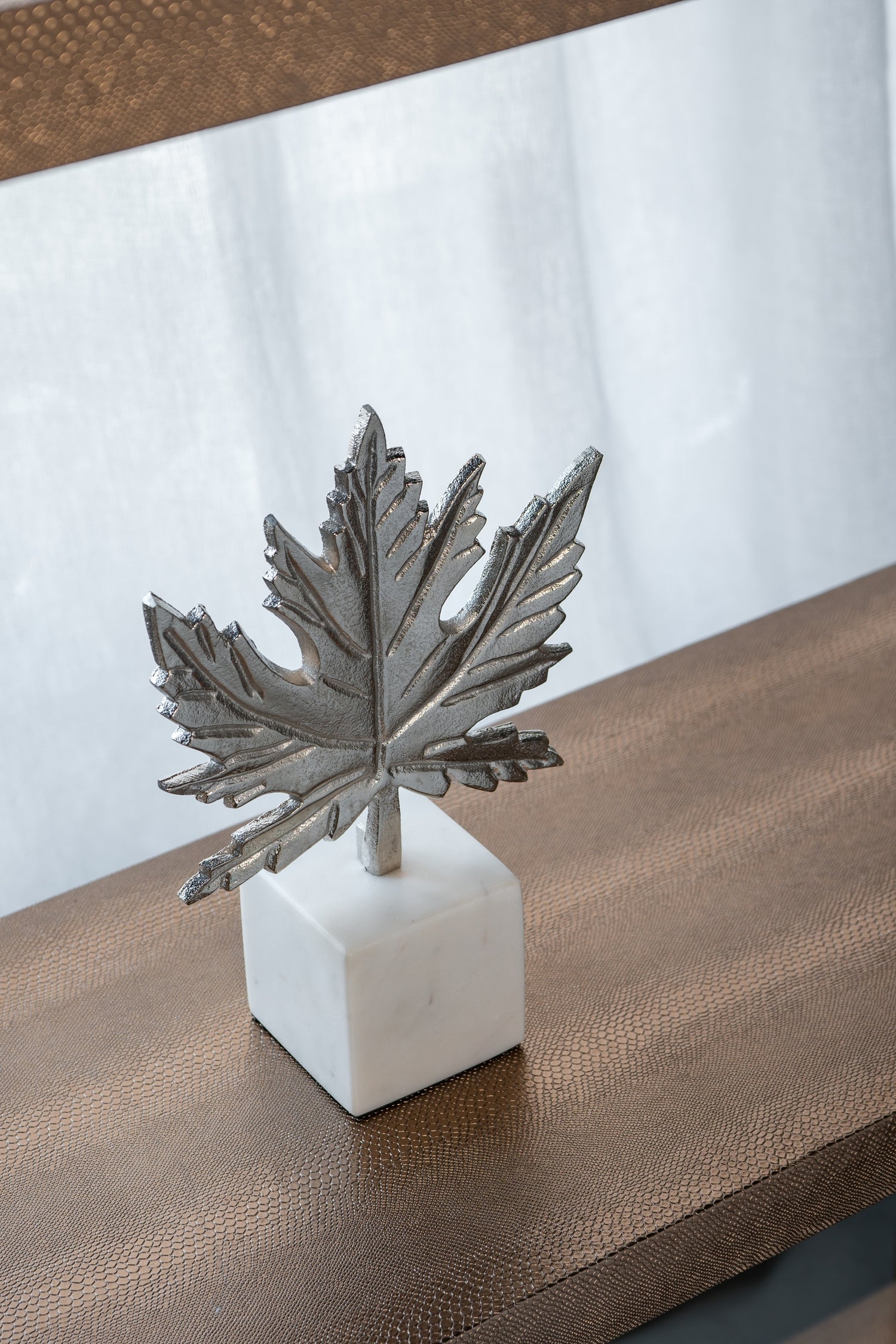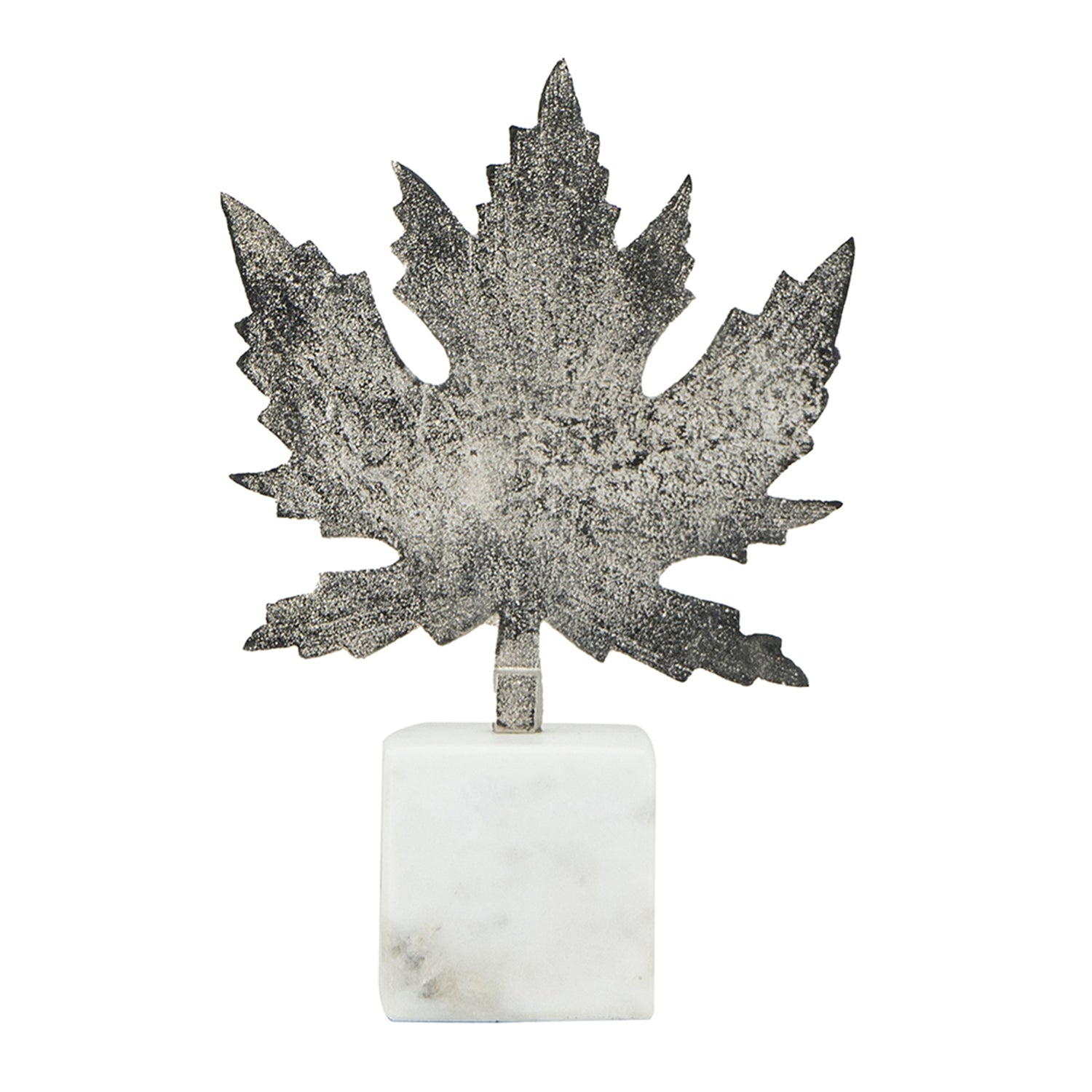 This elegant silver leaf sculpture comes on a marble base. Crafted from aluminum, it makes a great addition to any room.