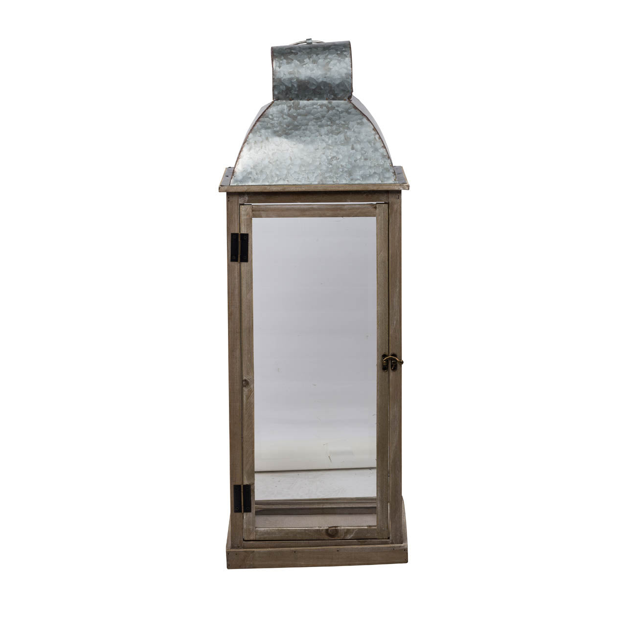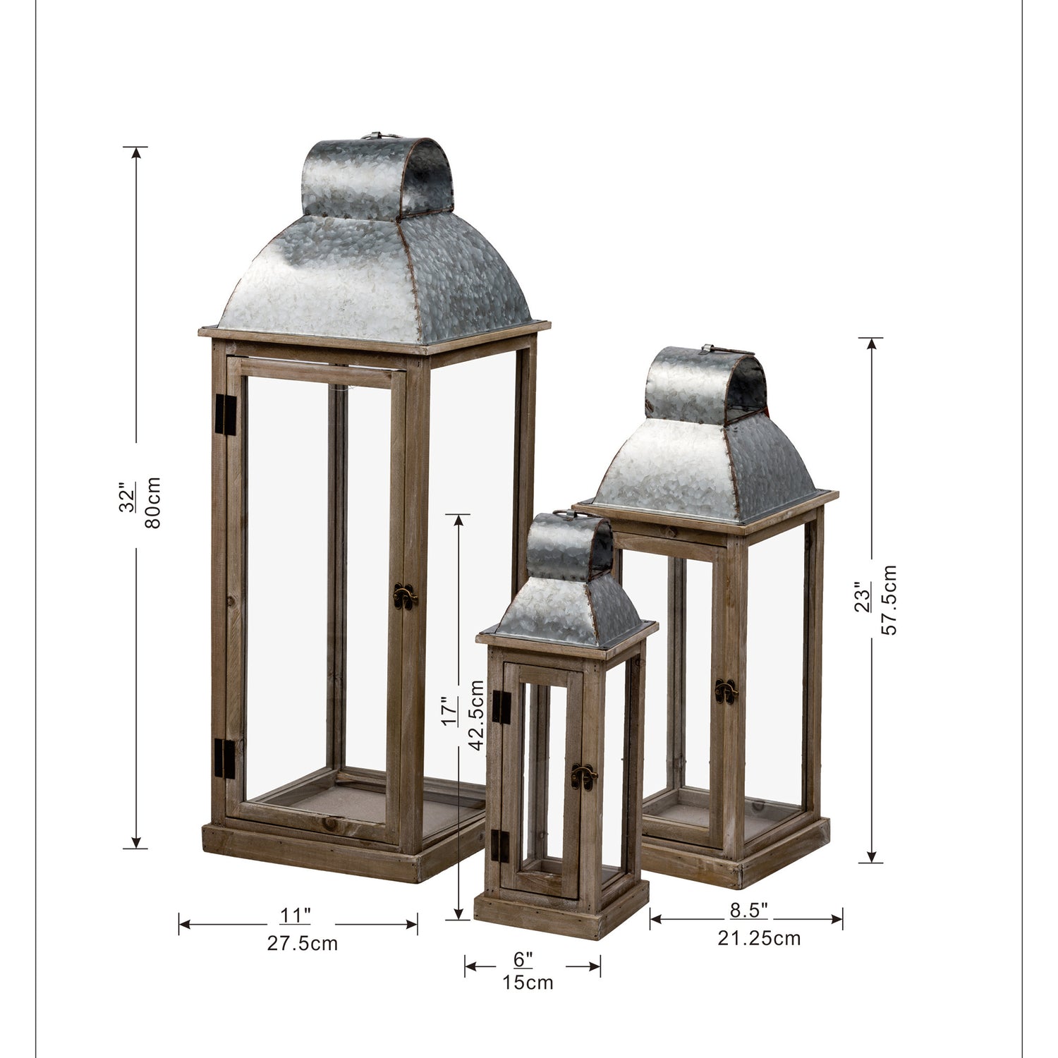 - Capturing the timeless charm of country design, this set includes three rectangular lanterns, each featuring a grained brown wood frame, a domed metal top, and clear glass panels.