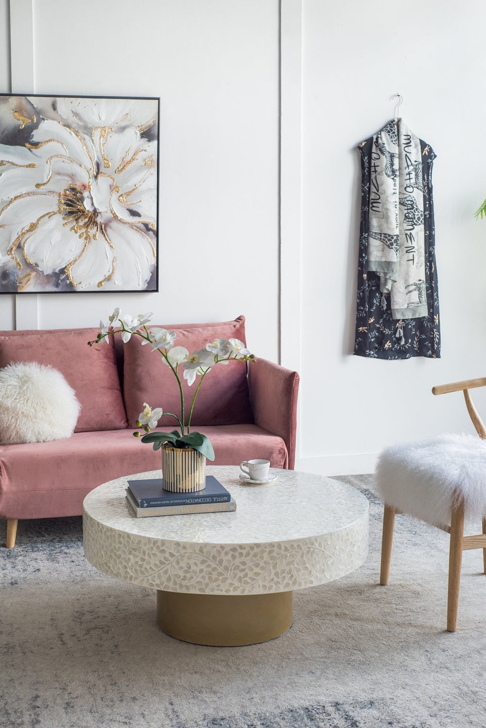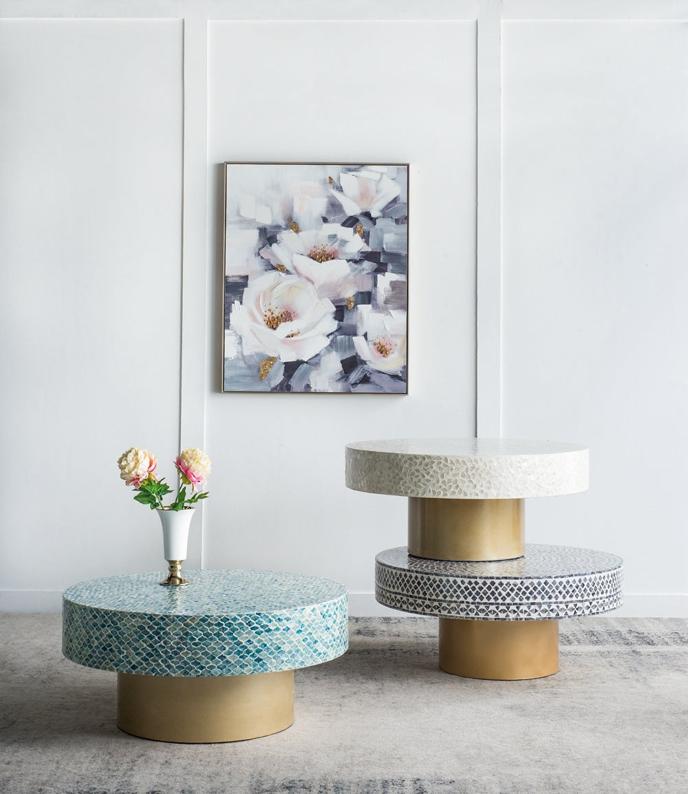 Add drama and functionality to your living room with the Capella coffee table. Crafted in cream it features a gorgeous leafy vine capiz design formed from meticulously inlaid peices and complemented with a pedestal base. Perfect for a luxe retreat or contemporary bohemian room.