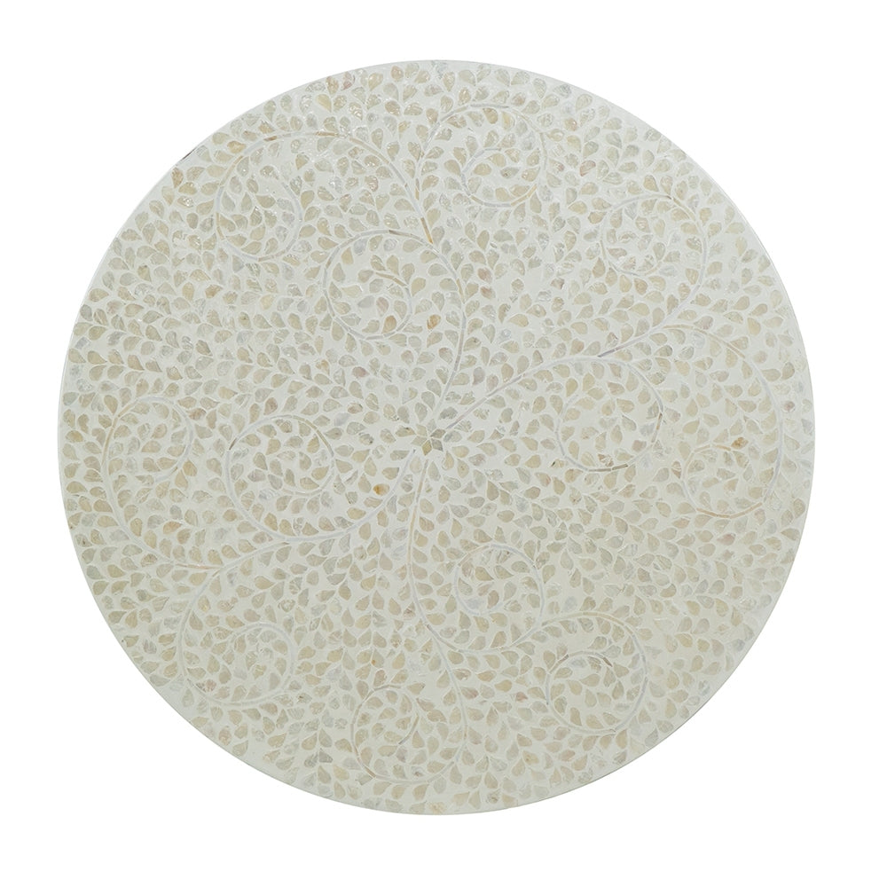 - Crafted in cream it features a gorgeous leafy vine capiz design formed from meticulously inlaid peices and complemented with a pedestal base.