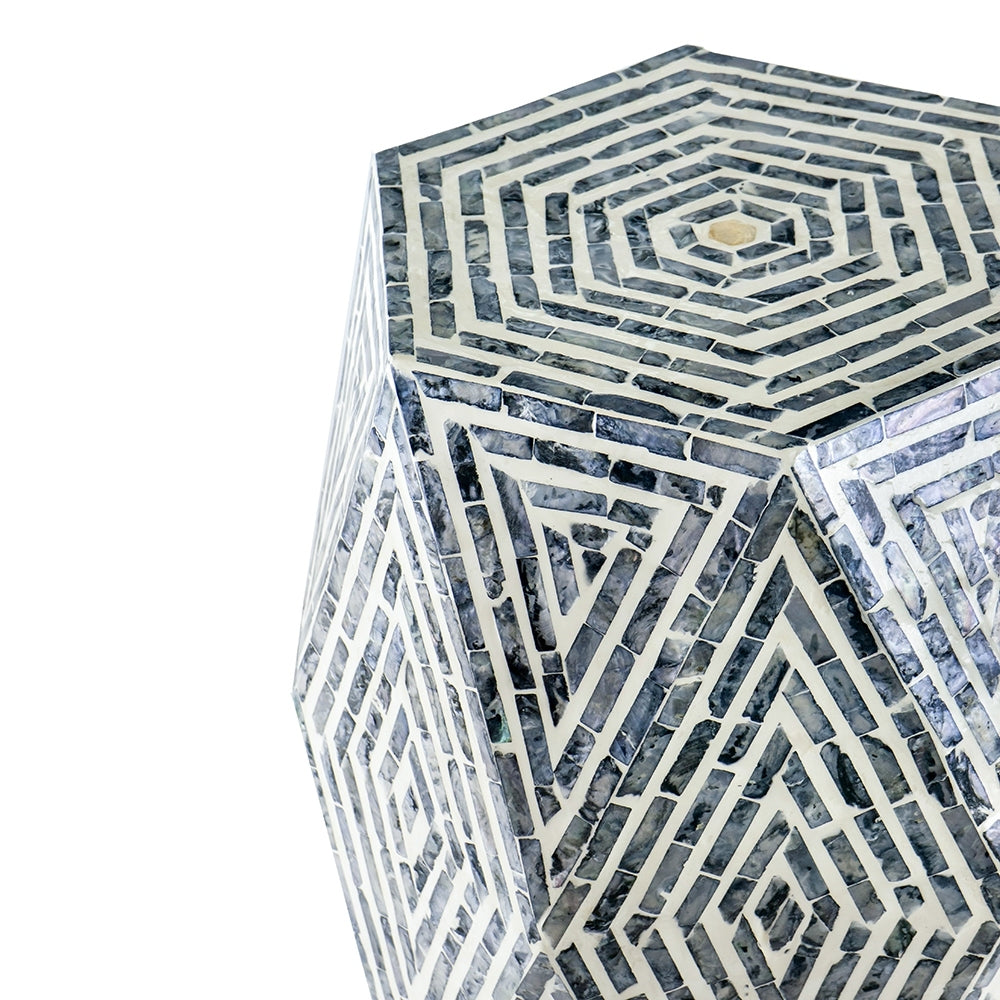- The angular faces of this hexagon pedestal stool feature an exquisite linear diamond design and Capiz inlay, a beautiful addition to a foyer or living room.