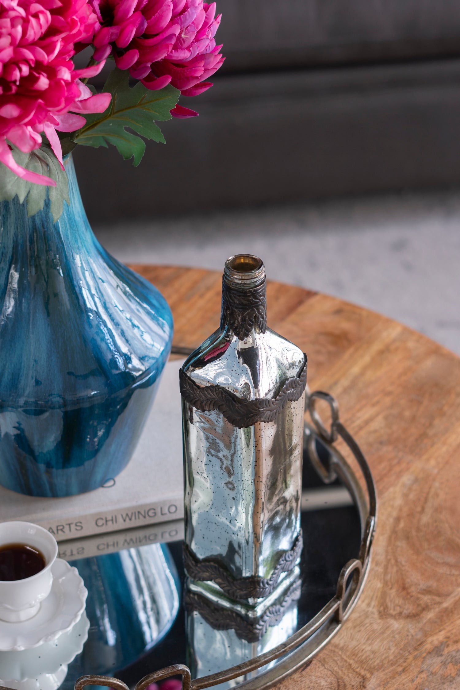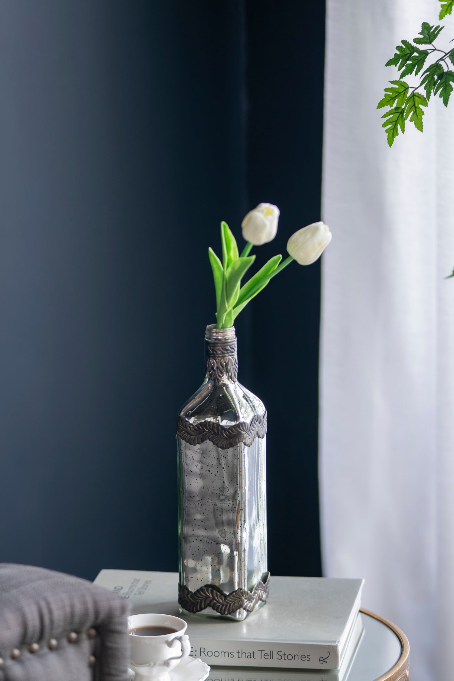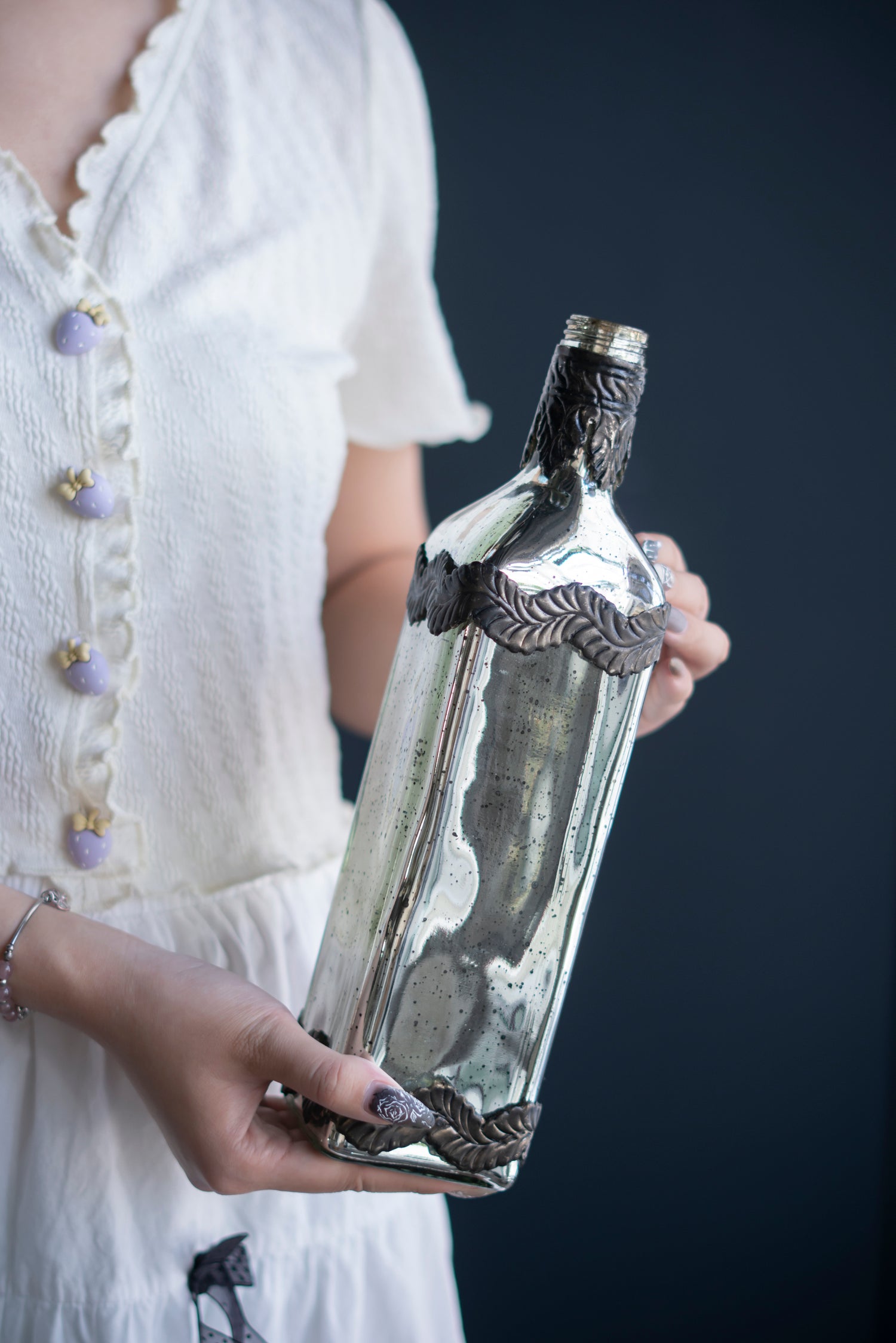 - Boasting a classic bottle silhouette, a speckled antique silver finish and adorning leaf patterns, this vase offers a unique edge to your home decor.
