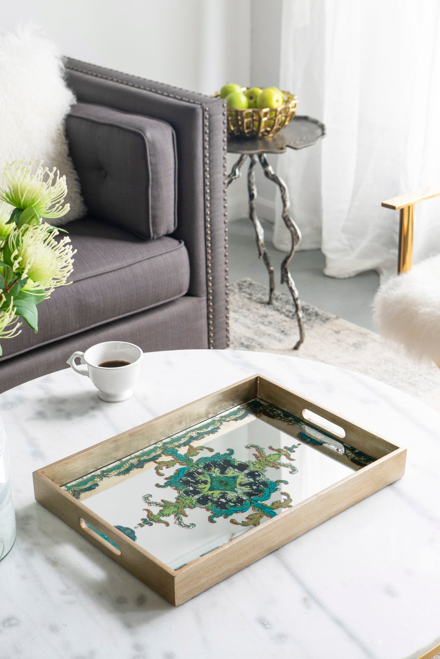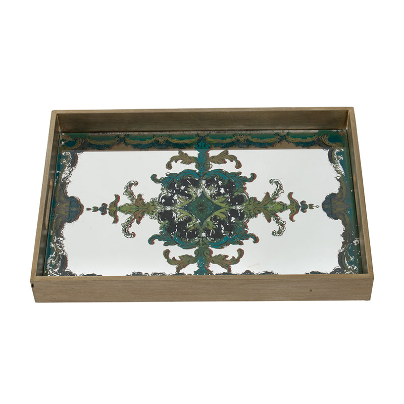 - Capturing the masterful beauty of vintage European tapestry, this mirrored tray features a classic rectangular silhouette, convenient cut-out handles, and a richly detailed medallion motif in shades of green and blue.