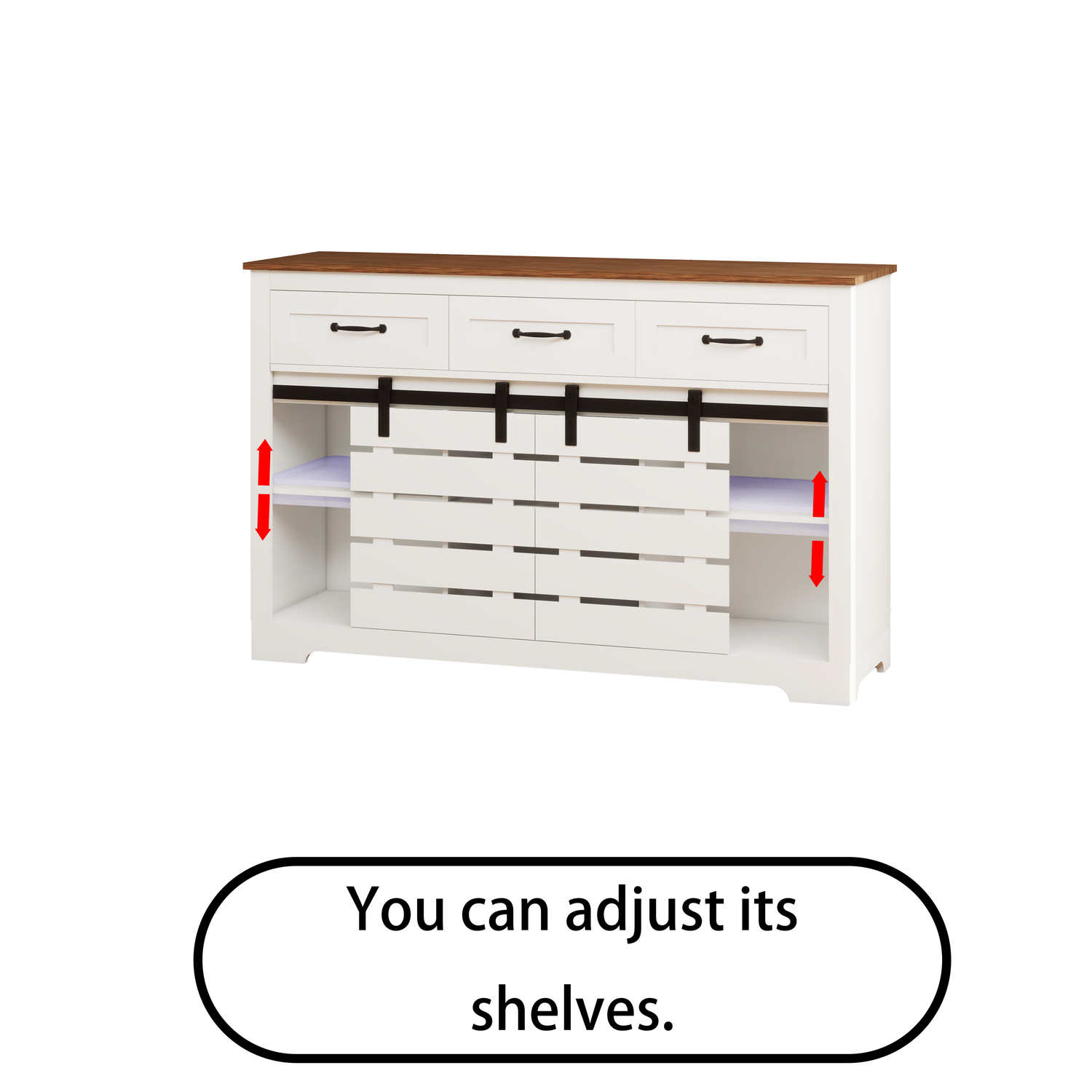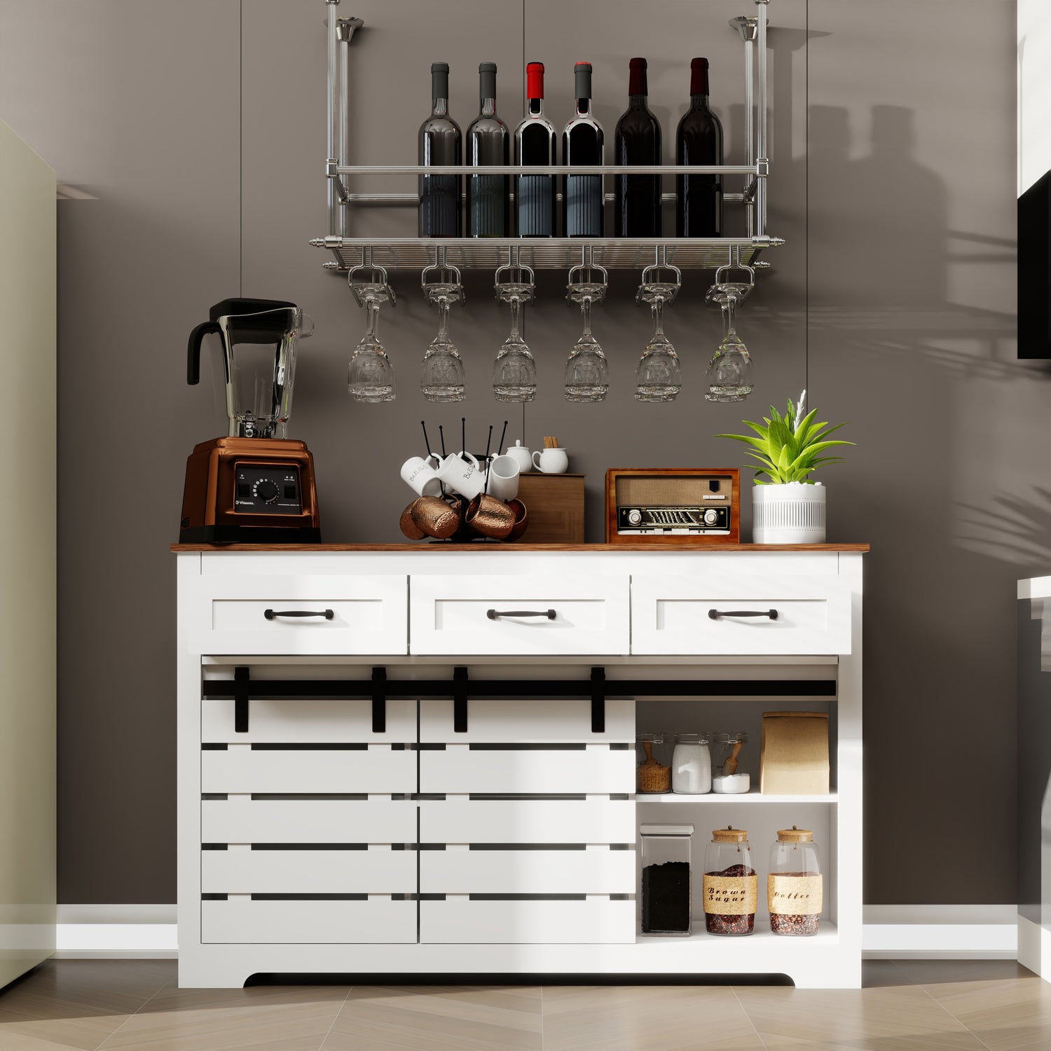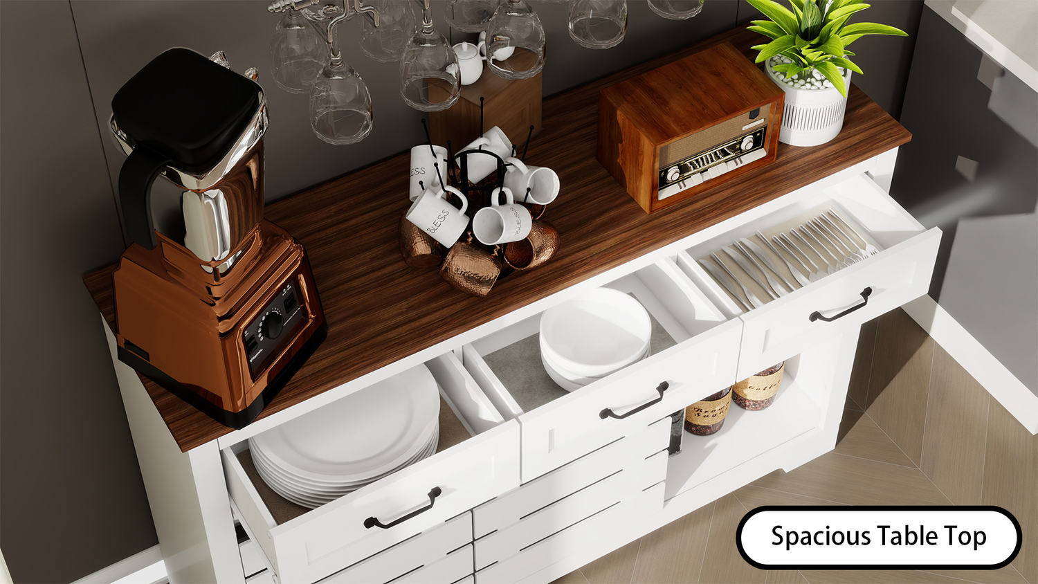 - Ample Storage Space: The buffet cabinet combines open and hidden storage space to meet your different needs. The spacious desktop can hold many items for easy access, such as coffee machine, microwave.the top 3 drawers help to neatly classify cutlery, and the bottom cabinets are all equipped with shelves, providing a variety of space to hold wine bottles, extra cutlery and other necessities.