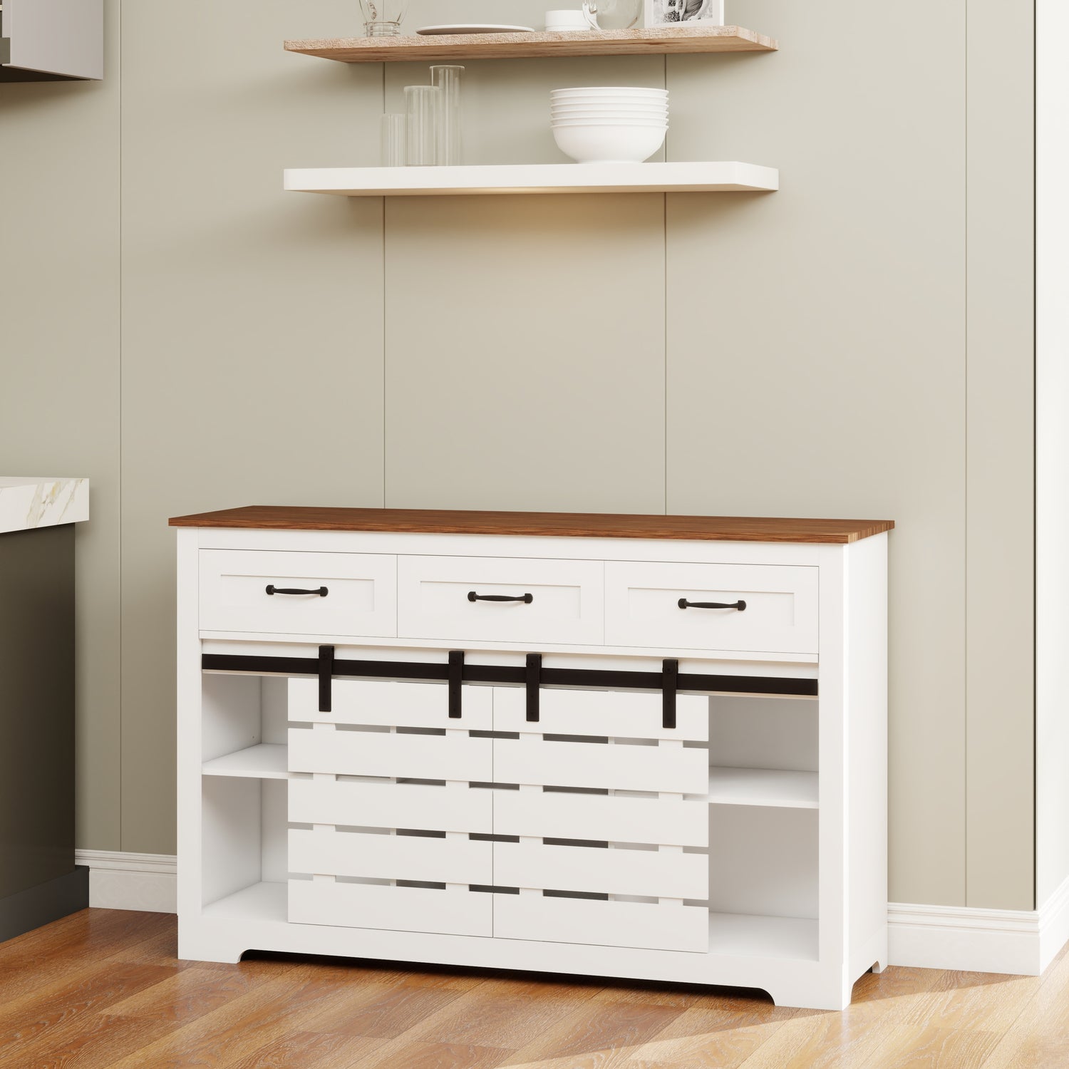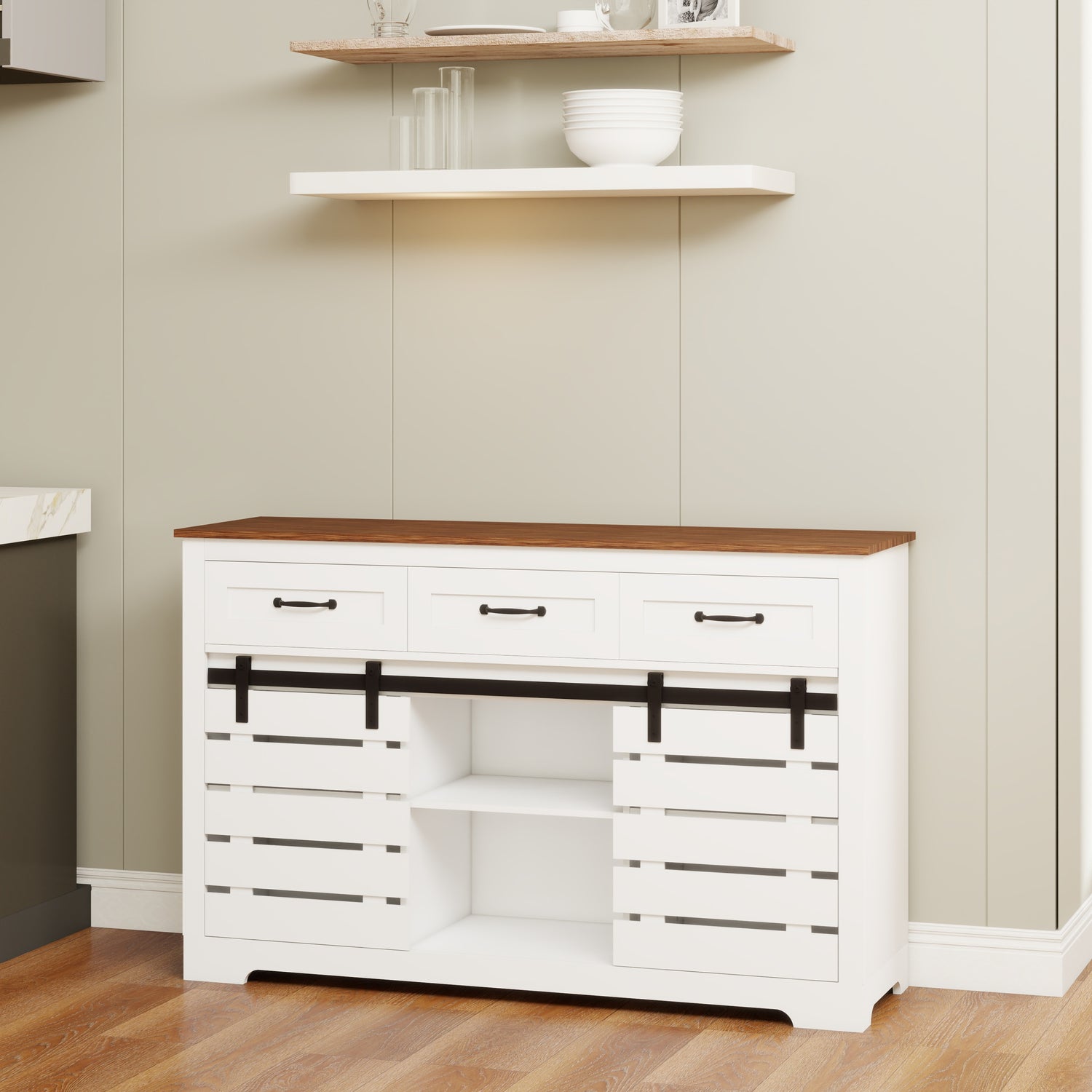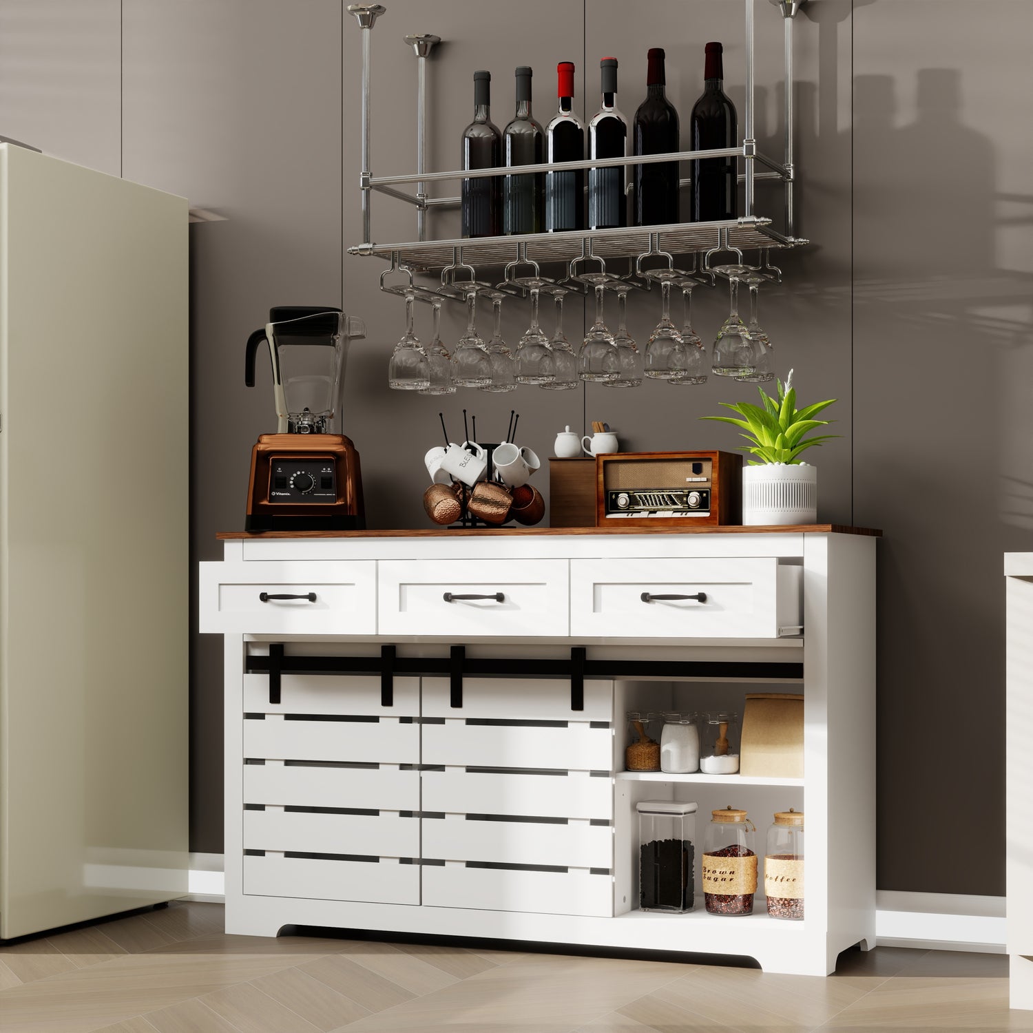 - Ample Storage Space: The buffet cabinet combines open and hidden storage space to meet your different needs. The spacious desktop can hold many items for easy access, such as coffee machine, microwave.the top 3 drawers help to neatly classify cutlery, and the bottom cabinets are all equipped with shelves, providing a variety of space to hold wine bottles, extra cutlery and other necessities.